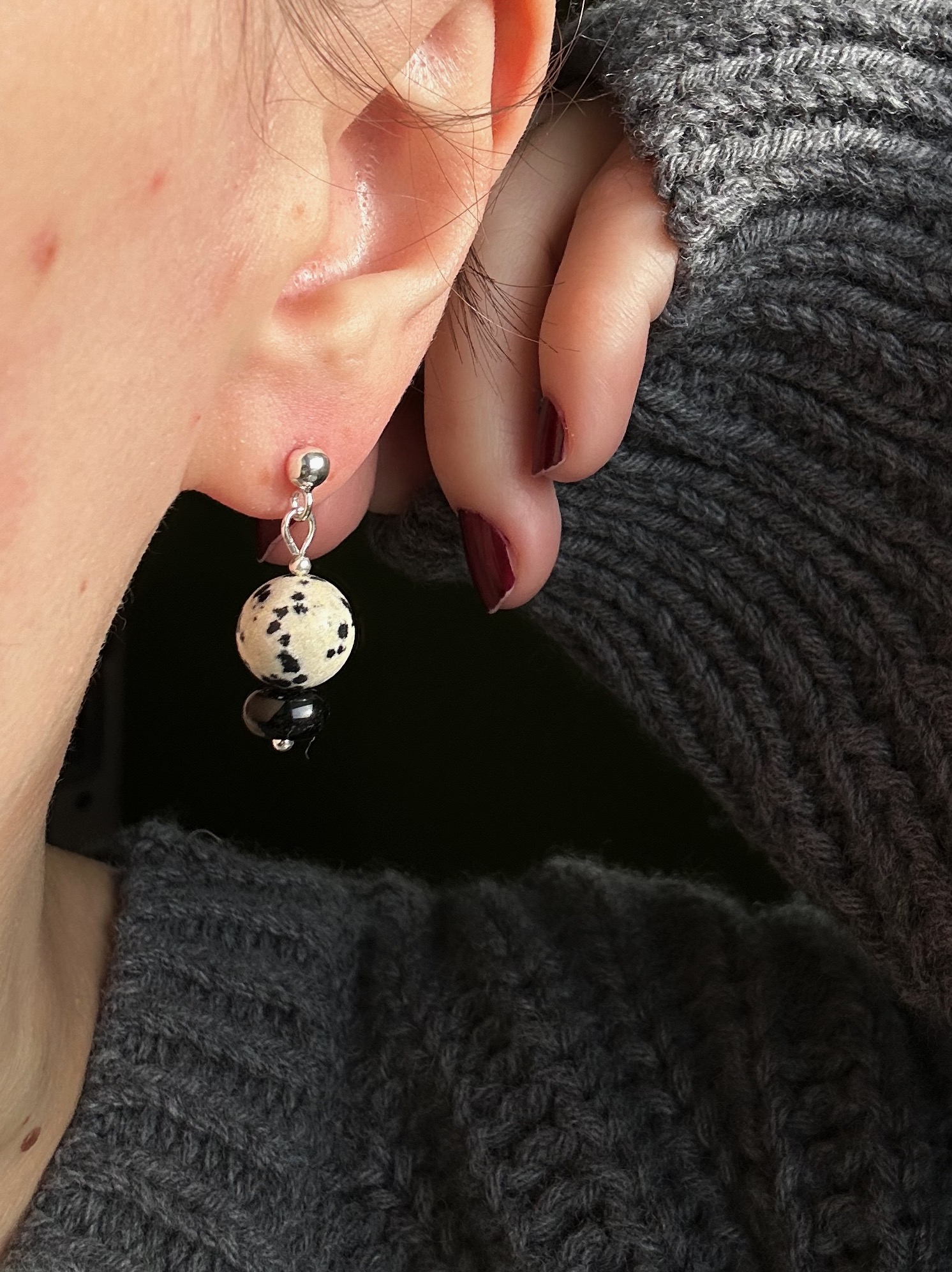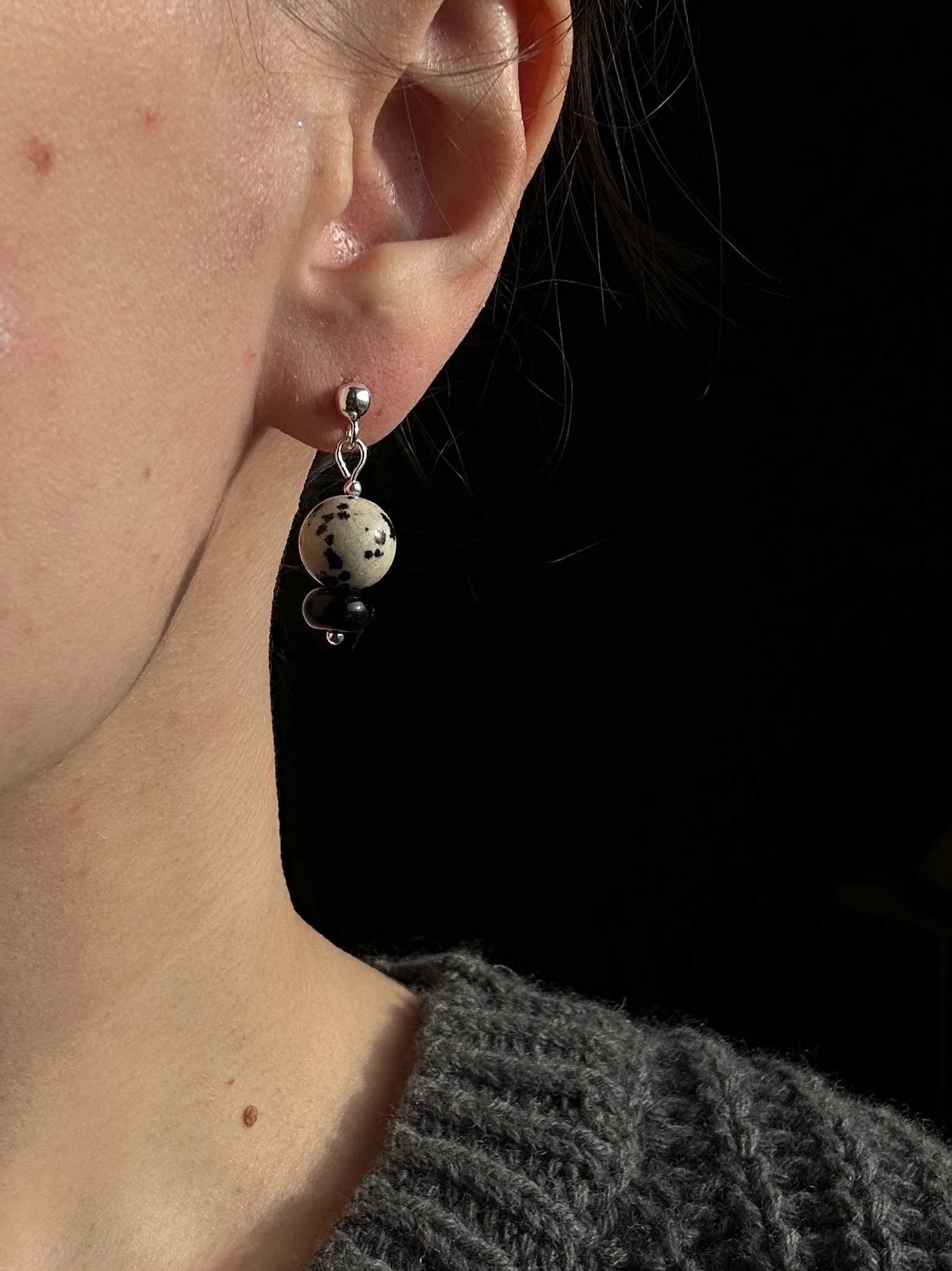 Kolczyki Freckles to jaspis dalmatyński w połączeniu z onyksem. Zawieszone są na prostym srebrnym sztyfcie z kuleczką, zapinanym na klasyczny baranek.