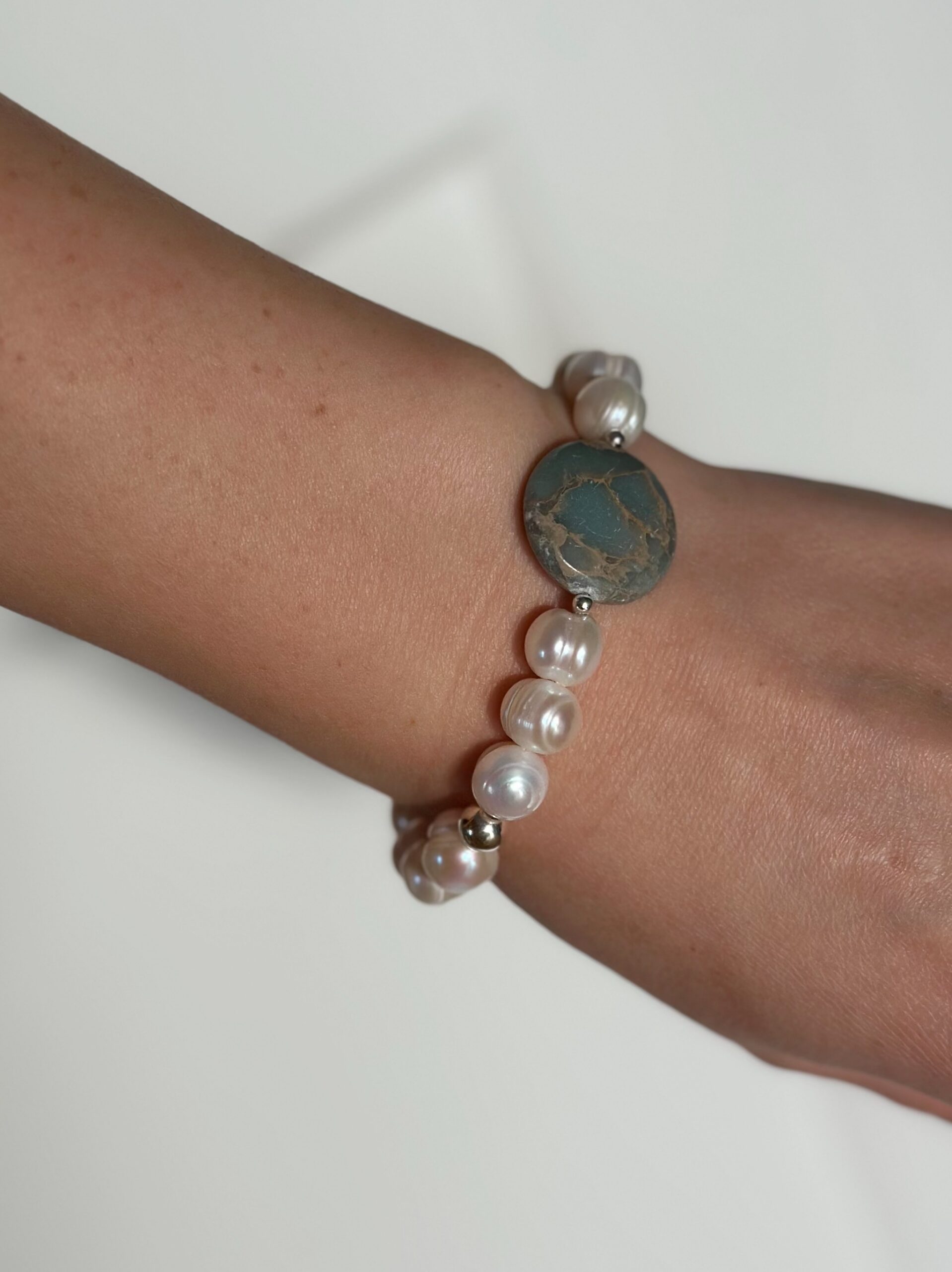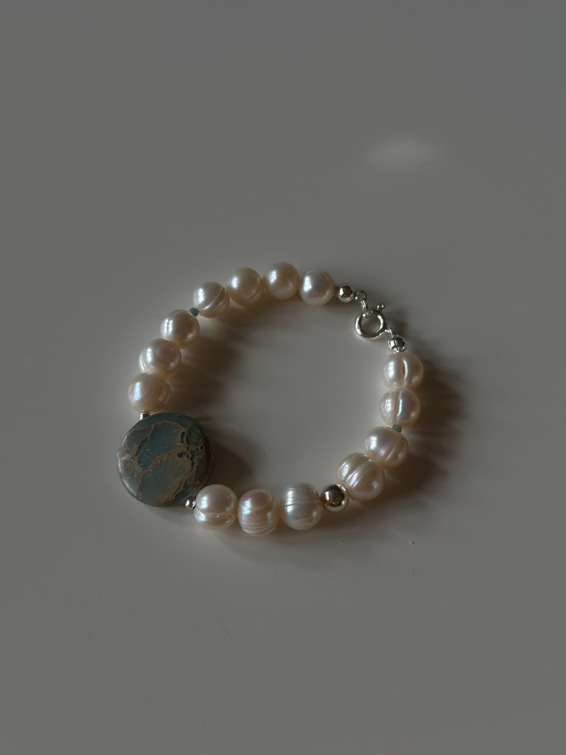 Bransoletka Adelaida to połączenie pereł, kamieni szlachetnych i półszlachetnych oraz srebra. Adelaidzie jako dodatek do pereł posłużył duży jaspis, drobne kamyki larimaru oraz duże i małe kulki ze srebra.