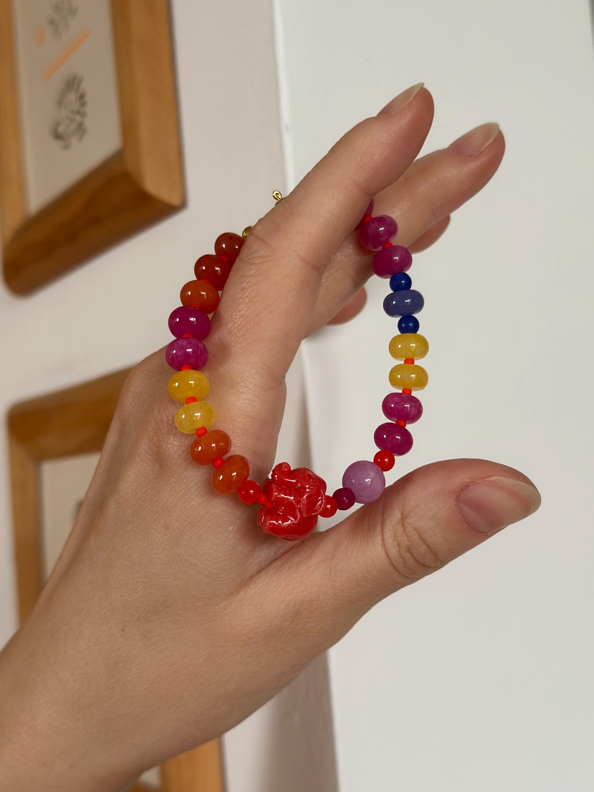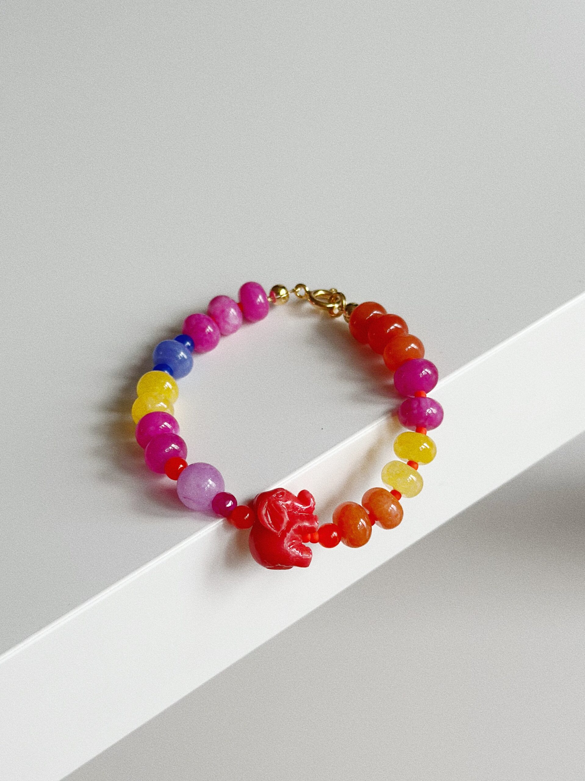 Bransoletka Elephant ze słonikiem i kolorowymi kamieniami. Kamienie użyte do wykonania bransoletki to wielokolorowe jadeity w kształcie oponek i kulek. Bransoletka nawinięta jest na linkę jubilerską, przez co trzyma ładnie swój kształt na ręce.