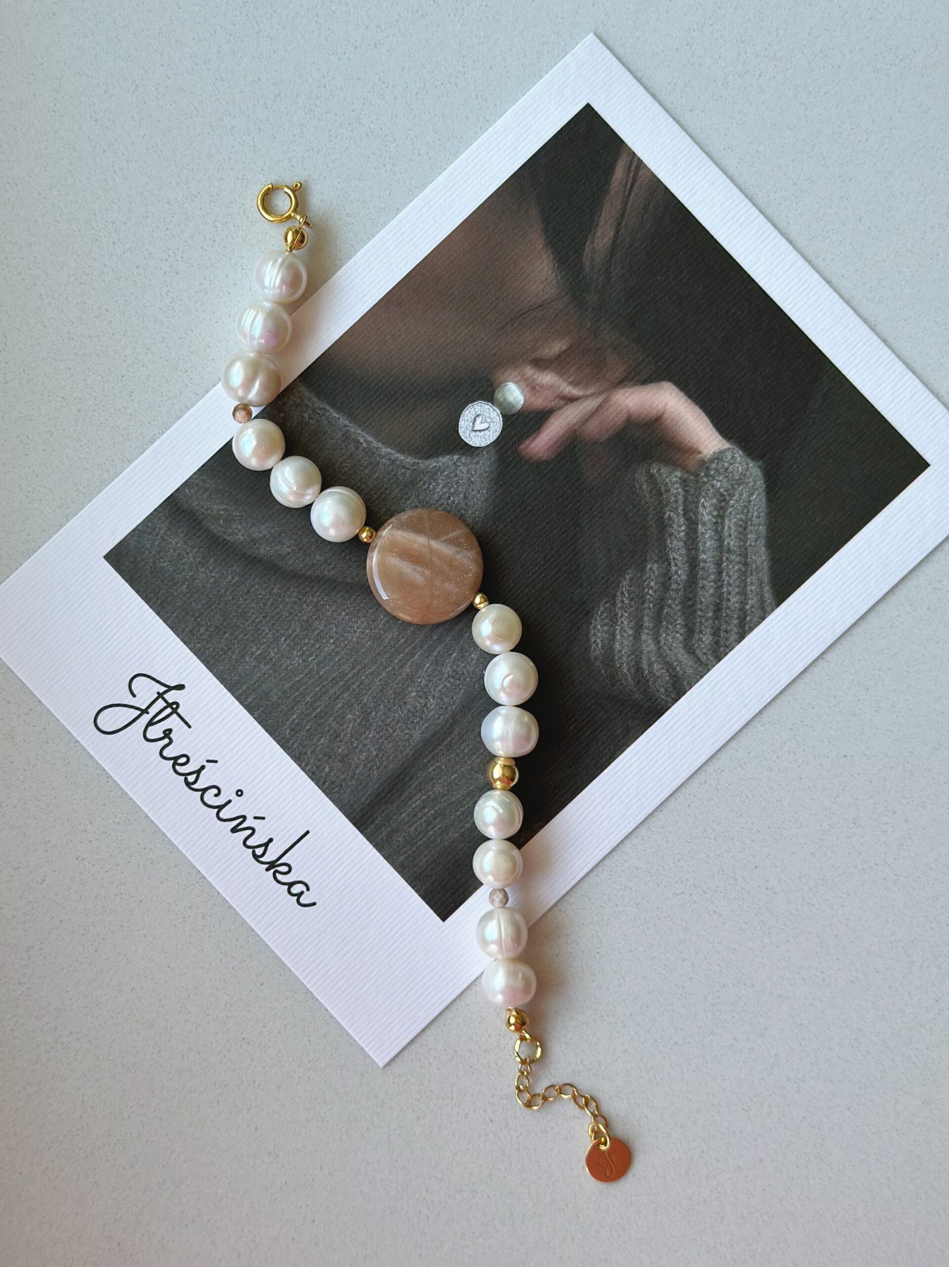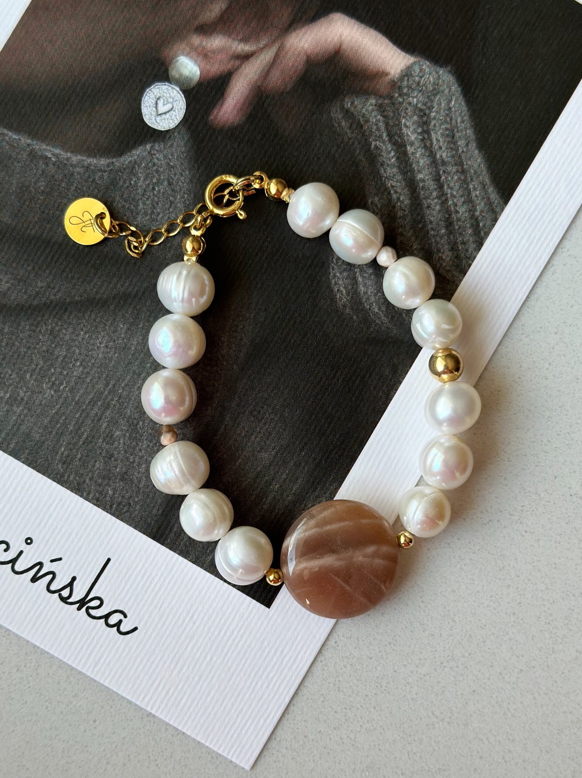 Bransoletka Nereida to połączenie pereł, kamieni szlachetnych i półszlachetnych oraz złoconego srebra. Nereidzie jako dodatek do pereł posłużył duży kamień słoneczny, drobne kamyki agatu oraz duże i małe kulki ze złoconego srebra i złota goldfilled.