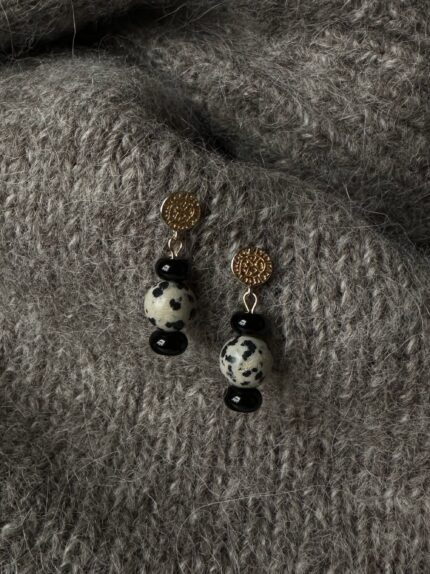 Kolczyki Cold Wave to chłodny angelit w kolorze baby blue i jadeit marmurkowy, ciosany tak, by odbijał światło i dodawał delikatnego blasku.