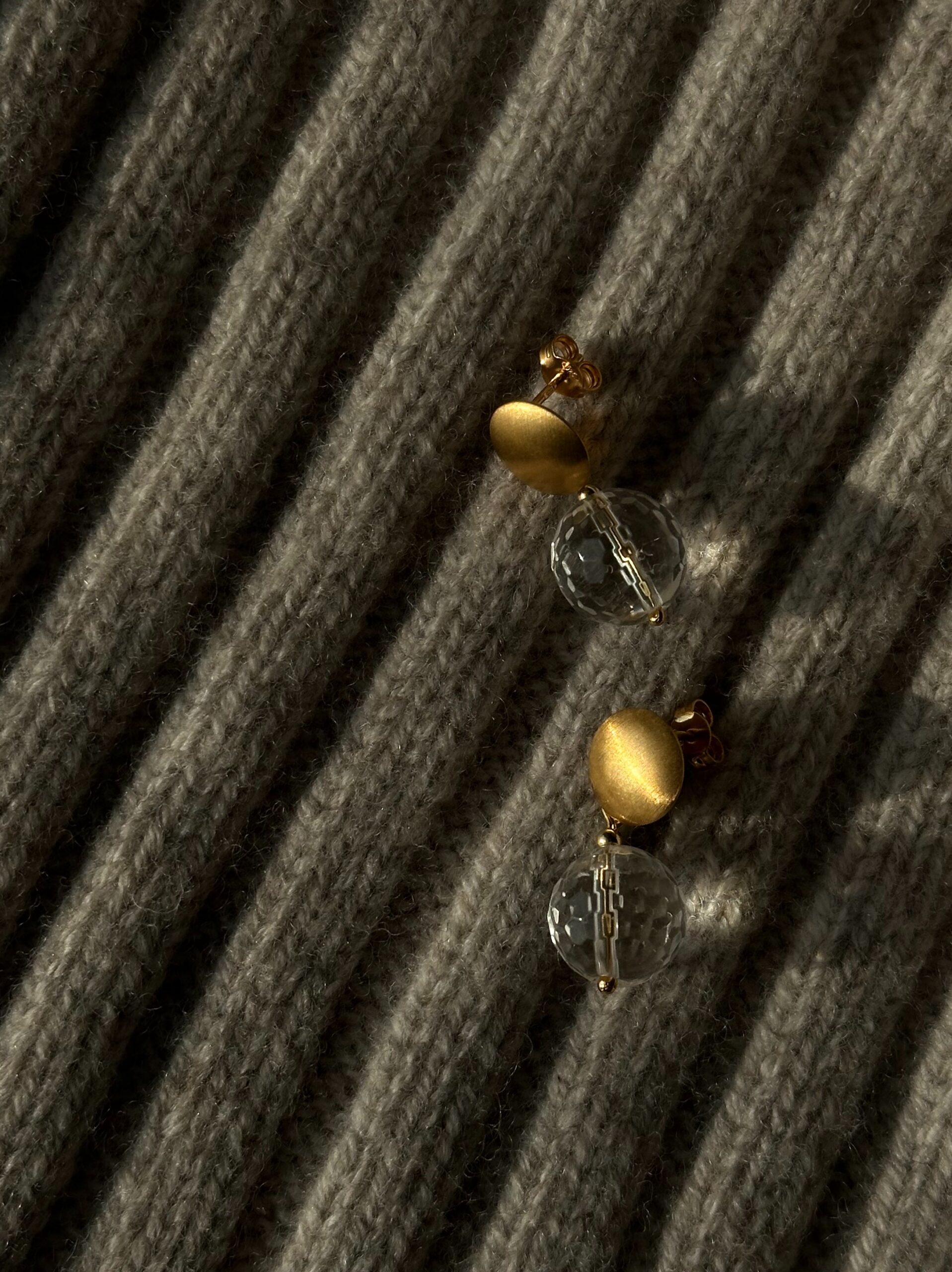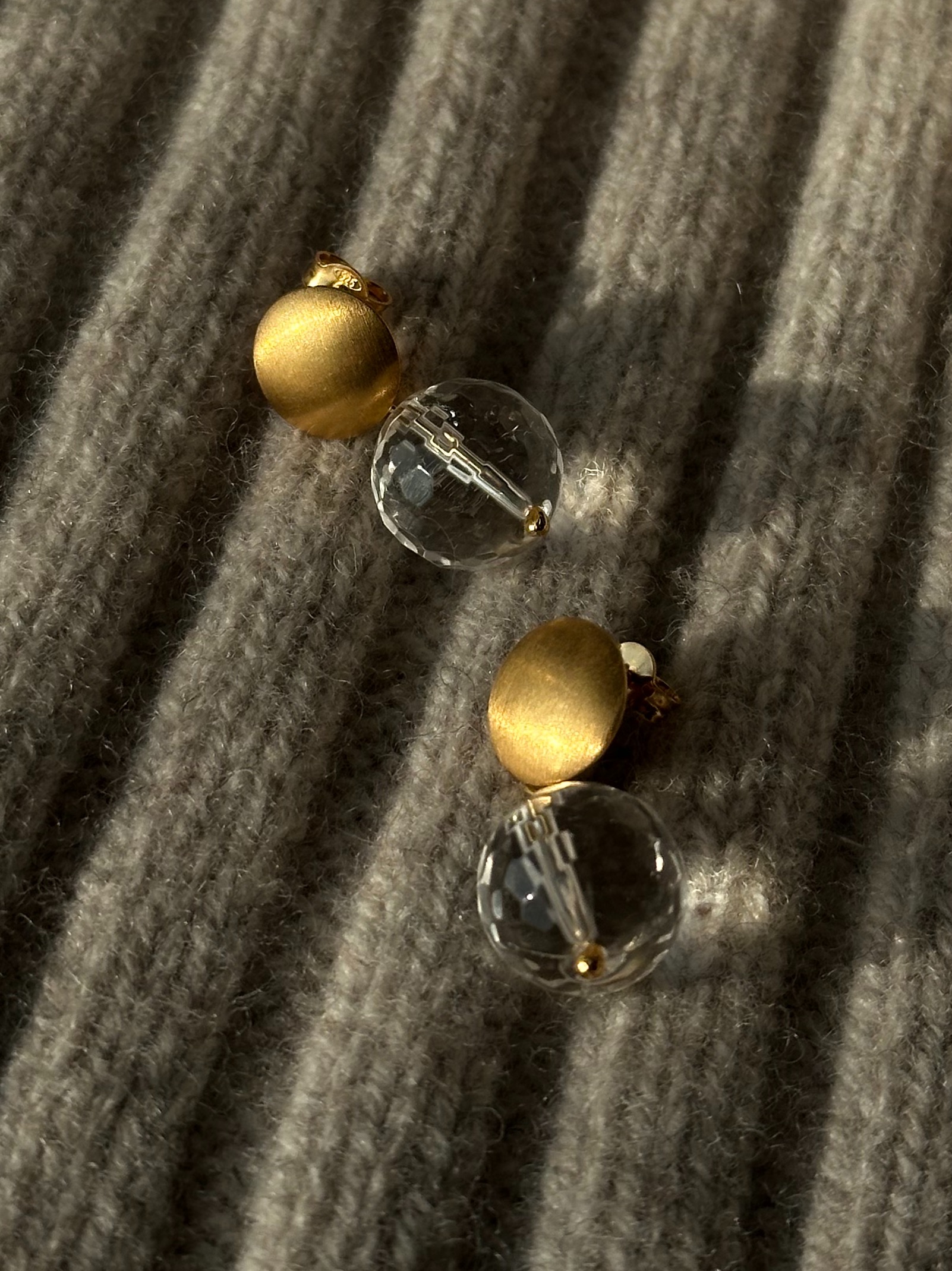 Kolczyki Disco Ball to zmatowione, złocone sztyfty ze srebra i kula z kryształu górskiego, która przypomina kulę dyskotekową.