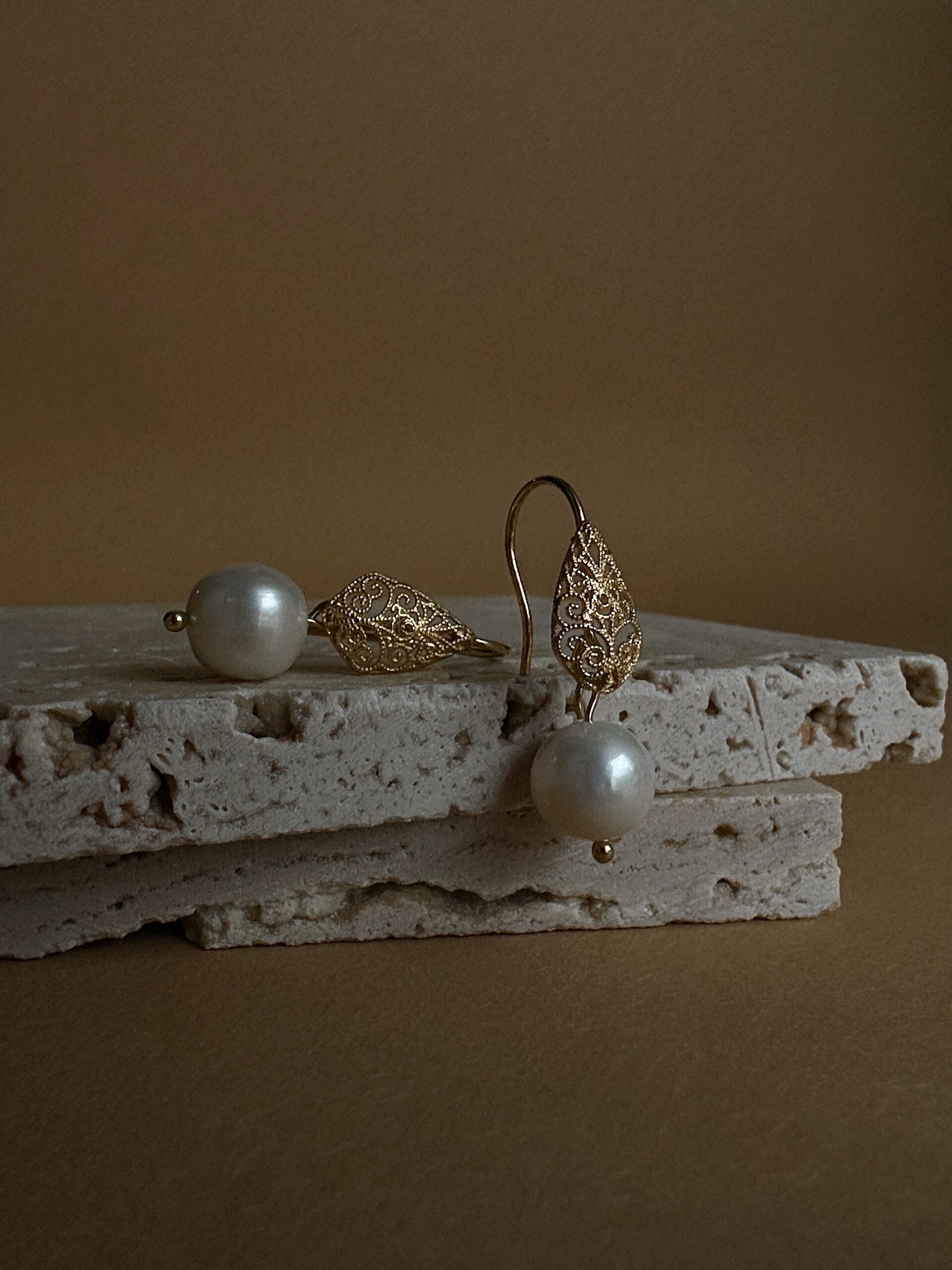 Kolczyki Lace Pearl to białe klasyczne perły zawieszone na koronkowym, mocno dekoracyjnym biglu. Wykonane ze złoconego srebra oraz białej perły naturalnej.