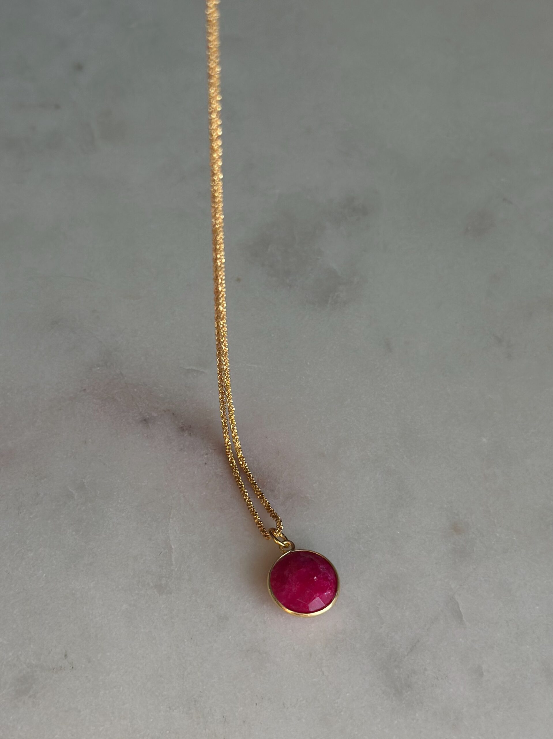Łańcuszek Ruby to kawałek rubinu fasetowanego w pozłacanym okuciu wiszący na ozobnym łańcuszku o ciekawym splocie. Rubin to kamień szlachetny, a ten jest o średnicy 1,2 cm.