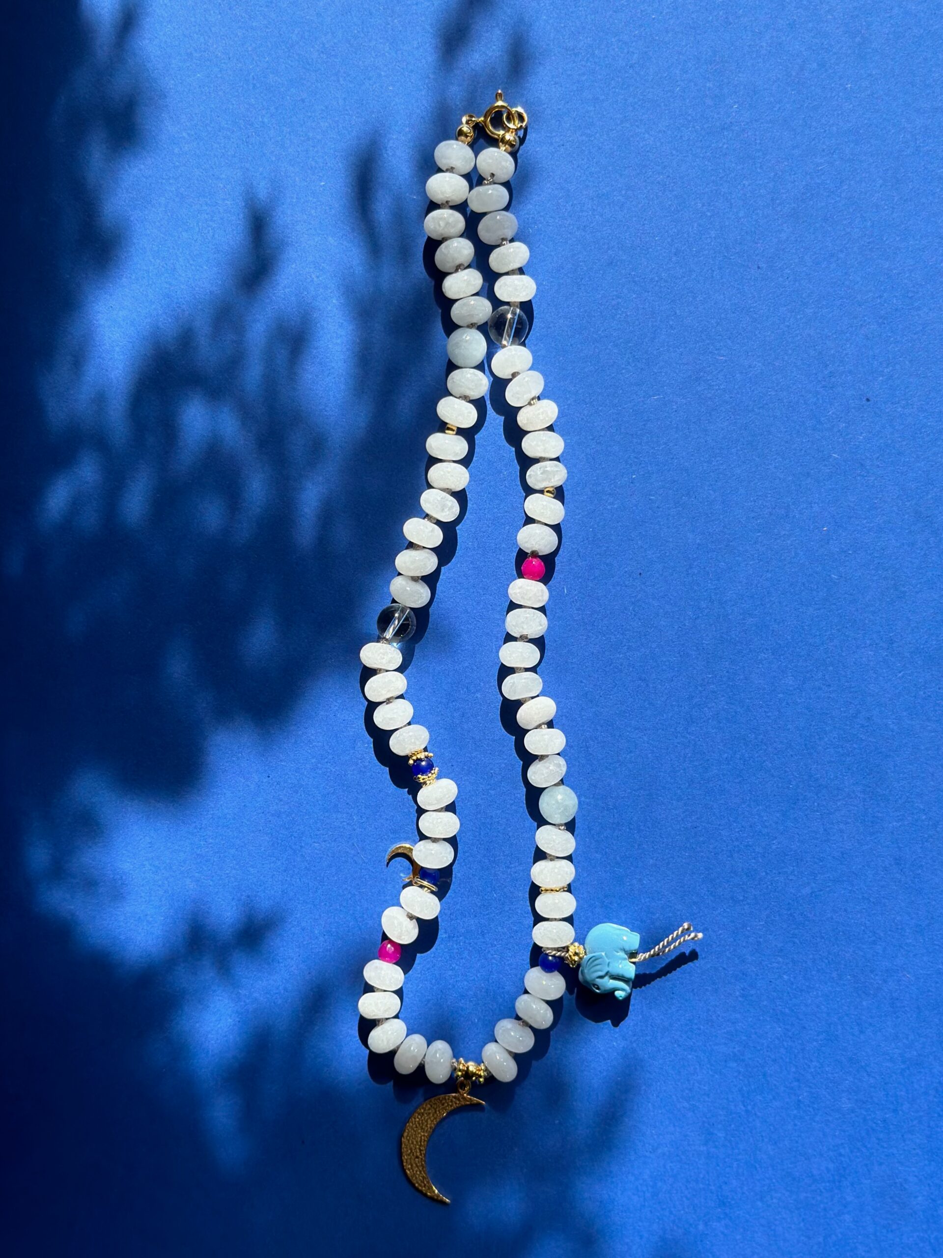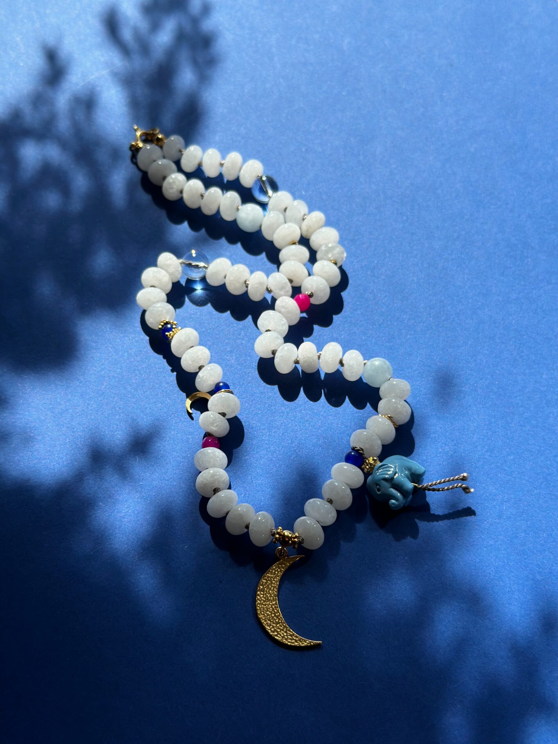 Naszyjnik wykonany z jadeitu w kremowym kolorze ze złotymi przekładkami ze srebra i zawieszką słonika oraz księżyca. Słonik wykonany jest ze sztucznego korala. Naszyjnik nawinięty jest na jedwabną nić i ręcznie supełkowany. Wszystkie metalowe elementy to złocone srebro pr. 925.