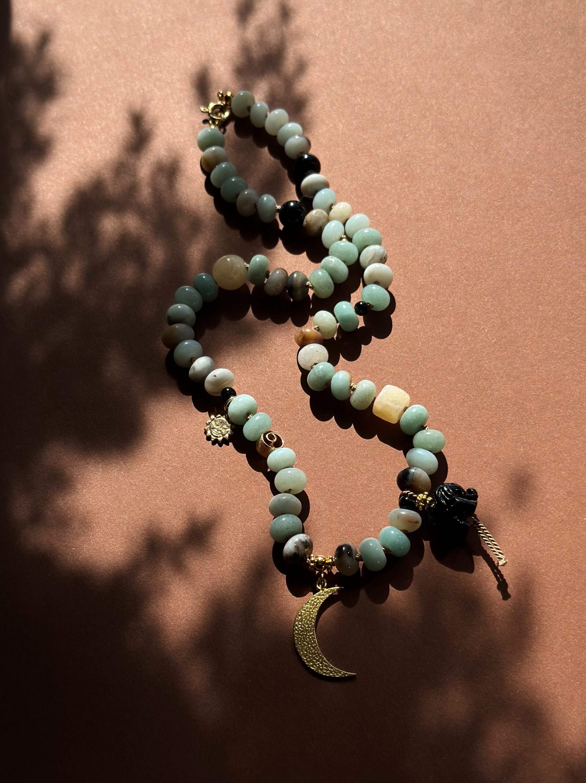 Naszyjnik wykonany z amazonitu w odcieniach turkusu i ziemi ze złotymi przekładkami ze srebra i zawieszką słonika oraz księżyca. Słonik wykonany jest ze sztucznego korala. Naszyjnik nawinięty jest na jedwabną nić i ręcznie supełkowany. Wszystkie metalowe elementy to złocone srebro pr. 925.