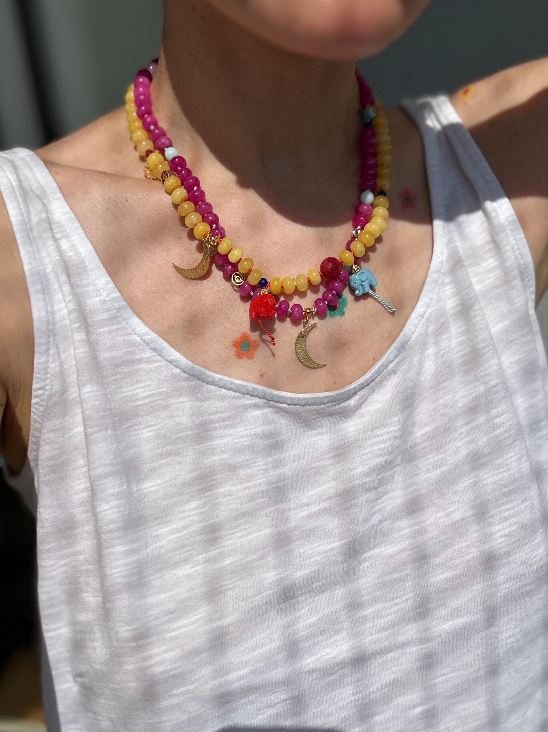 Naszyjnik wykonany z jadeitu w żółtym kolorze ze złotymi przekładkami ze srebra i zawieszką słonika oraz księżyca. Słonik wykonany jest ze sztucznego korala. Naszyjnik nawinięty jest na jedwabną nić i ręcznie supełkowany. Wszystkie metalowe elementy to złocone srebro pr. 925.