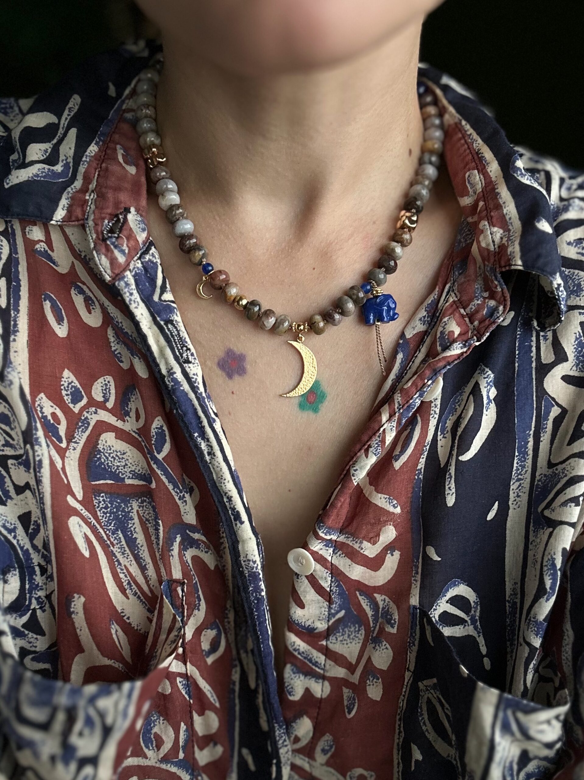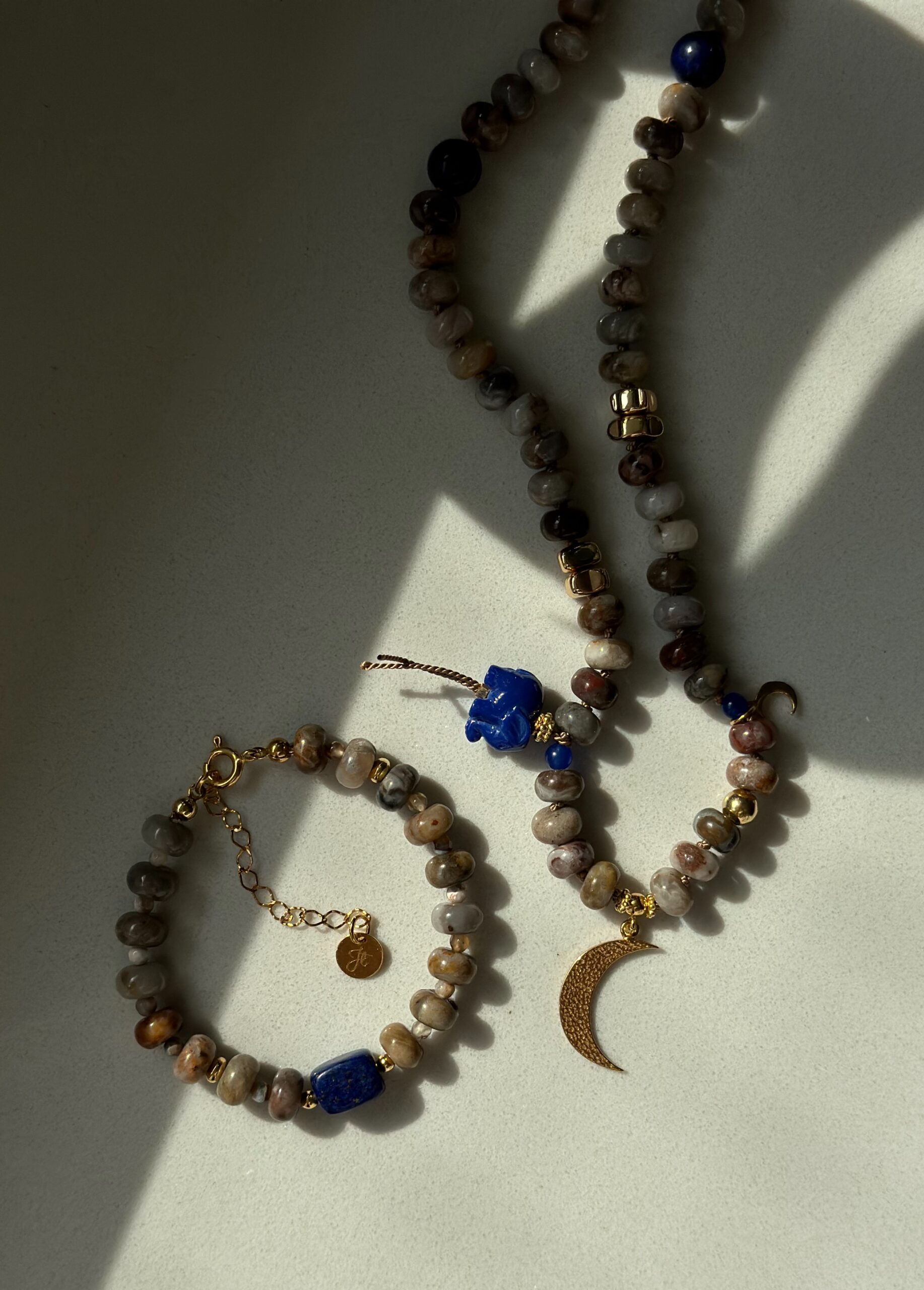 Naszyjnik wykonany z agatów w kolorze kawy z mlekiem ze złotymi przekładkami ze srebra oraz hematytu i zawieszką słonika oraz księżyca. Słonik wykonany jest ze sztucznego korala. Naszyjnik nawinięty jest na jedwabną nić i ręcznie supełkowany. Wszystkie metalowe elementy to złocone srebro pr. 925.