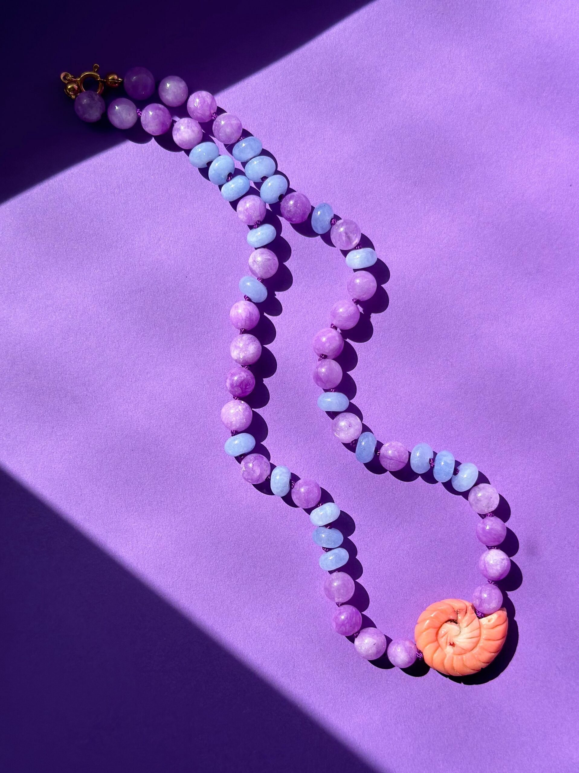 Naszyjnik Fossil to charakterystyczny ślimak z korala bambusowego oraz jadeity w dwóch kolorach i kształtach. Naszyjnik nawinięty jest na jedwabną nić, a pomiędzy kamieniami widać fioletowe supełki.