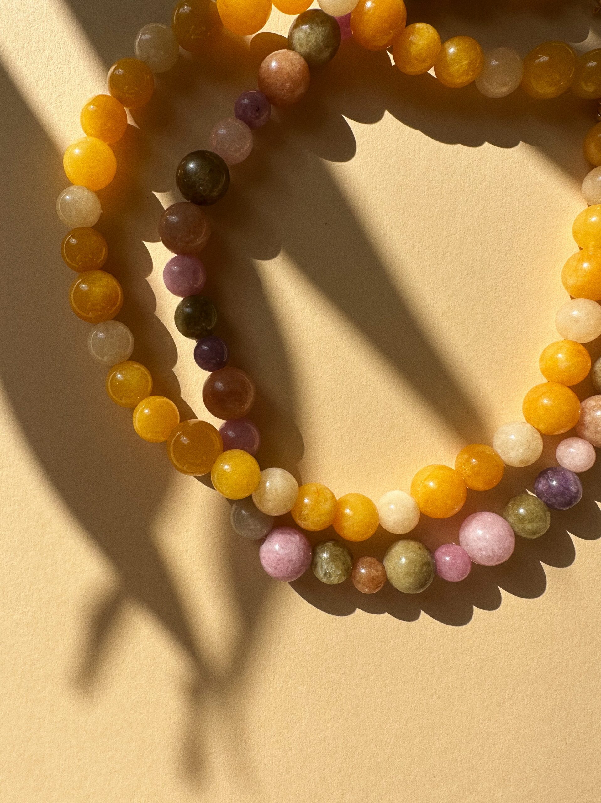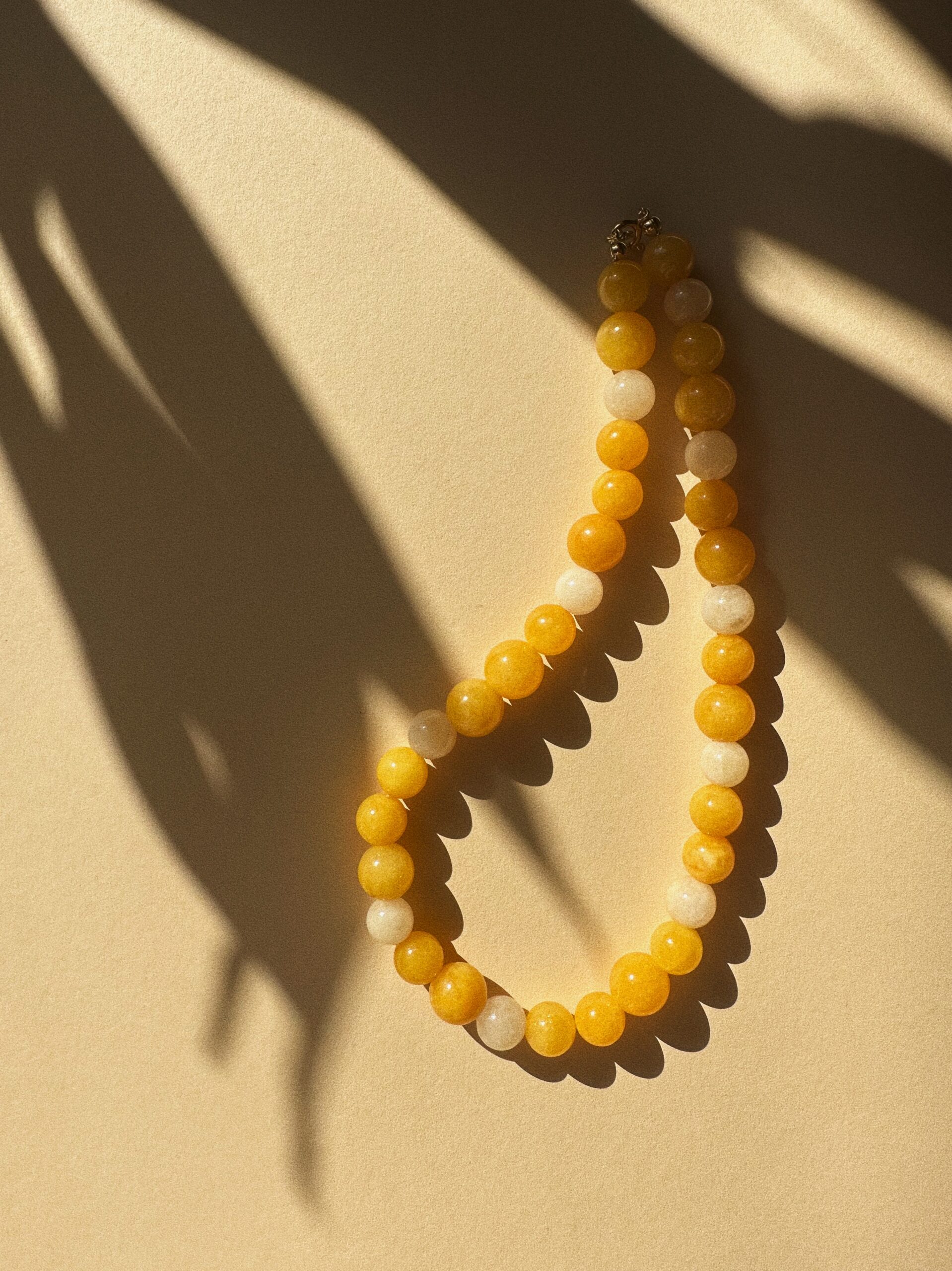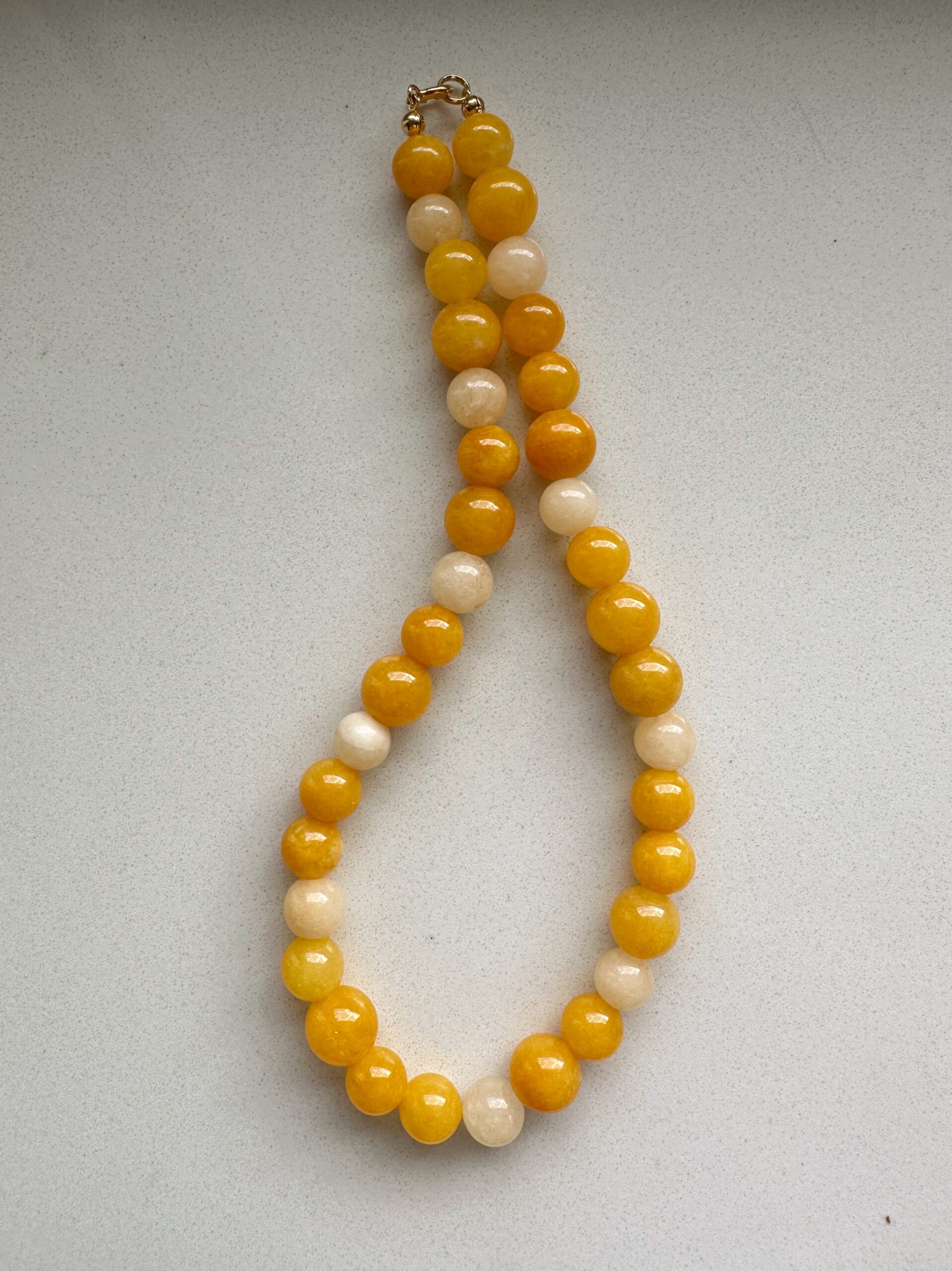 Naszyjnik Honey to żółty i kremowy jadeit, którego kolor kojarzy się z miodem. Kamienie to gładkie kule w dwóch rozmiarach. Naszyjnik nawinięty jest na wysokiej jakości nici oraz wykończony złoconym srebrem.