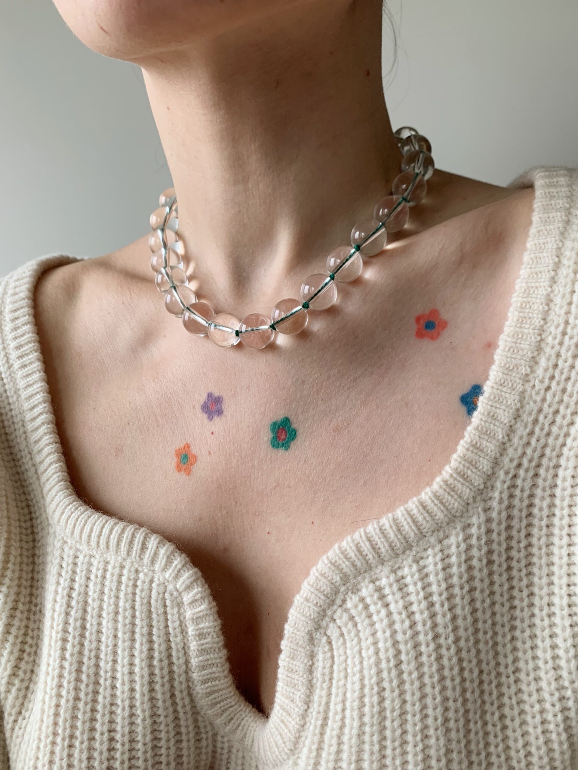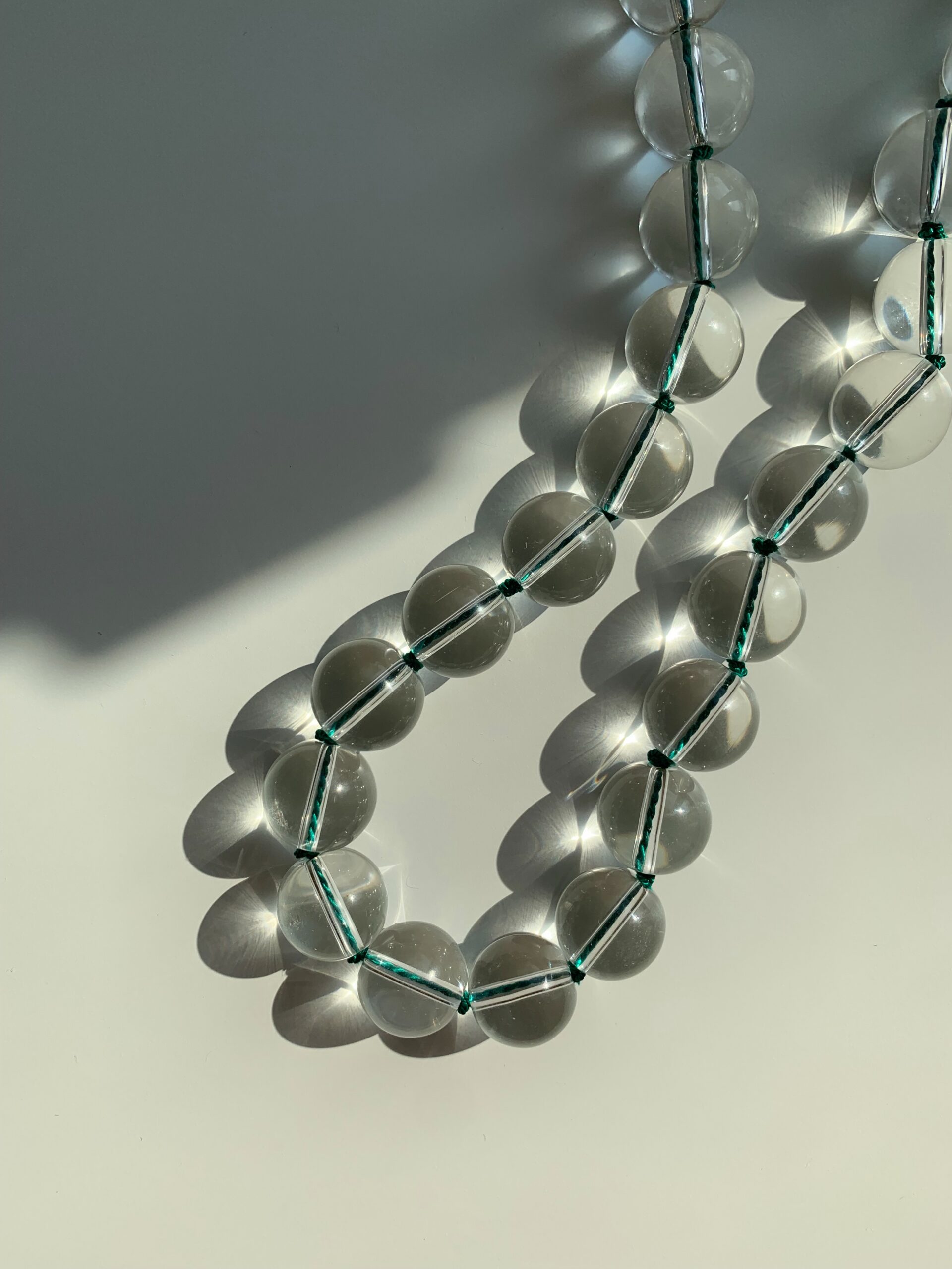 Naszyjnik Lustre to duże kulki z kryształu górskiego, przez który prześwituje zielona jedwabna nić. Naszyjnik wykonany jest metodą supełkowaną, zatem pomiędzy każdym kamieniem znajduje się supełek. Naszyjnik posiada przedłużkę z dużych ogniwek.