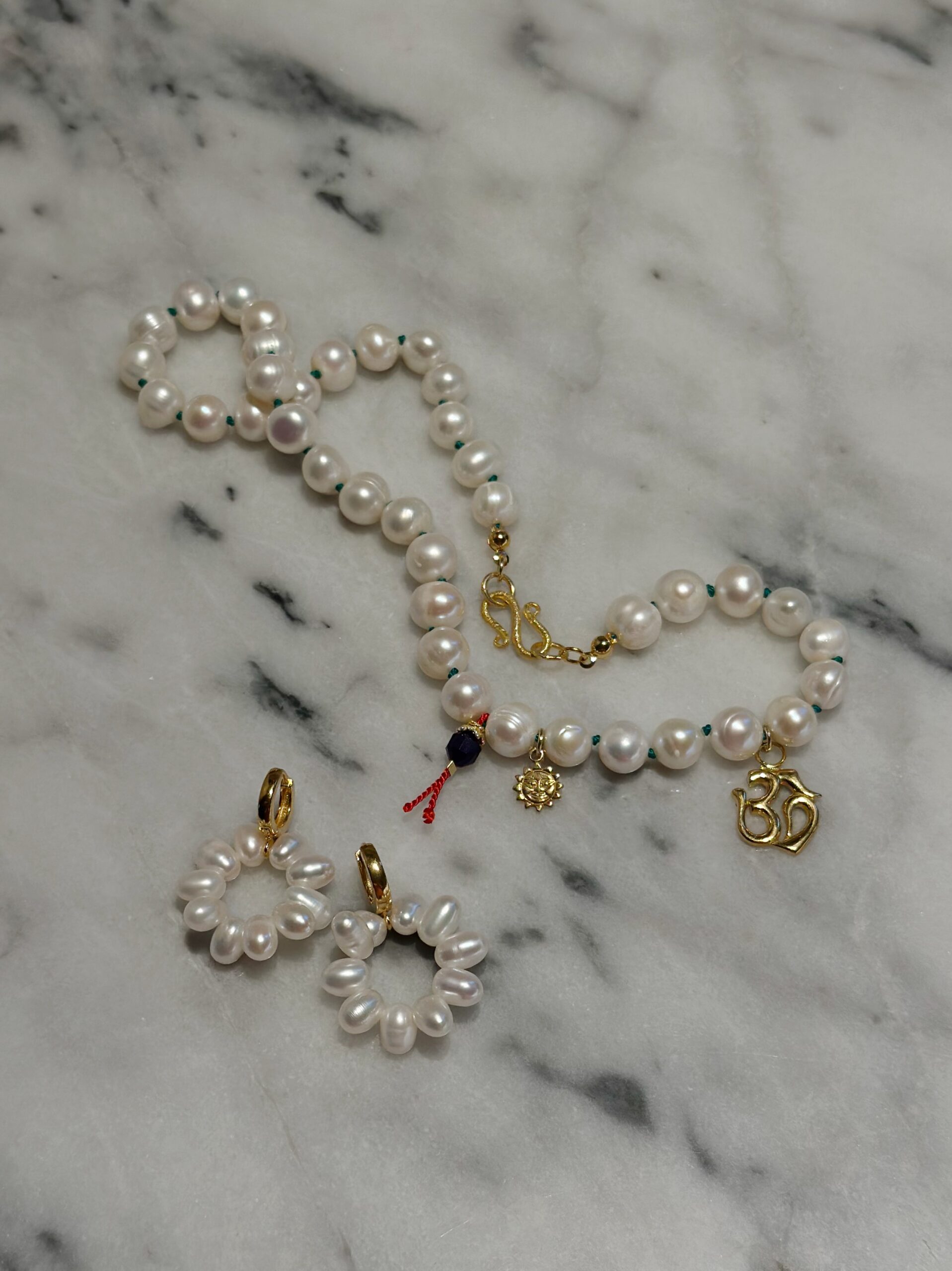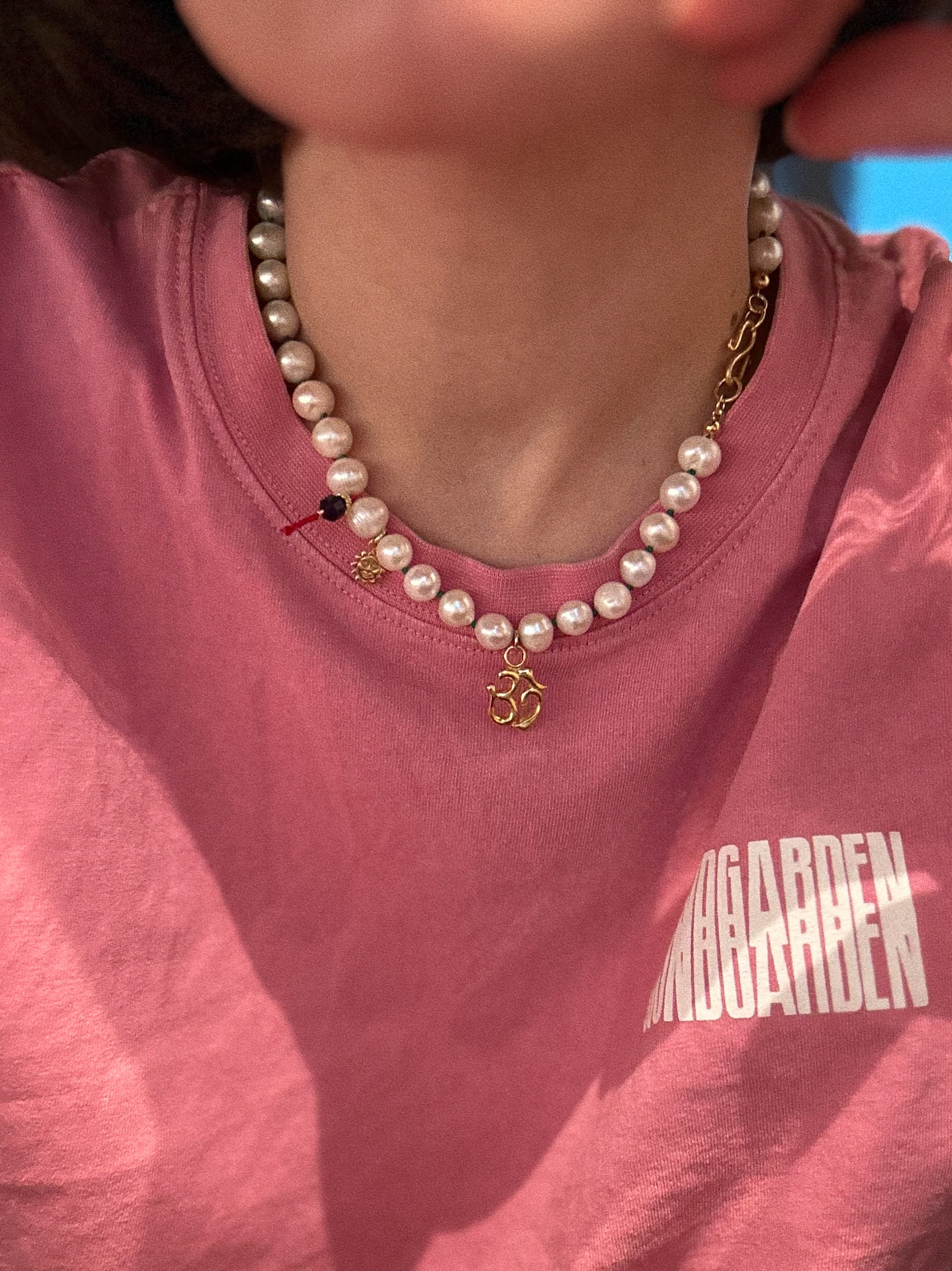 Naszyjnik Pearls Aum to klasyczne perły rowkowane oraz nawleczone klasyczną metodą supełkowania. Pomiędzy każdą perłą znajduje się supełek z jedwabnej nici, która nie tylko dodaje do naszyjnika twistu, ale też ma zabezpieczać perły przed zagubieniem, jeśli naszyjnik uległby zniszczeniu. Naszyjnik posiada fantazyjne zapięcie w kształcie litery S oraz zawieszkę – symbol.