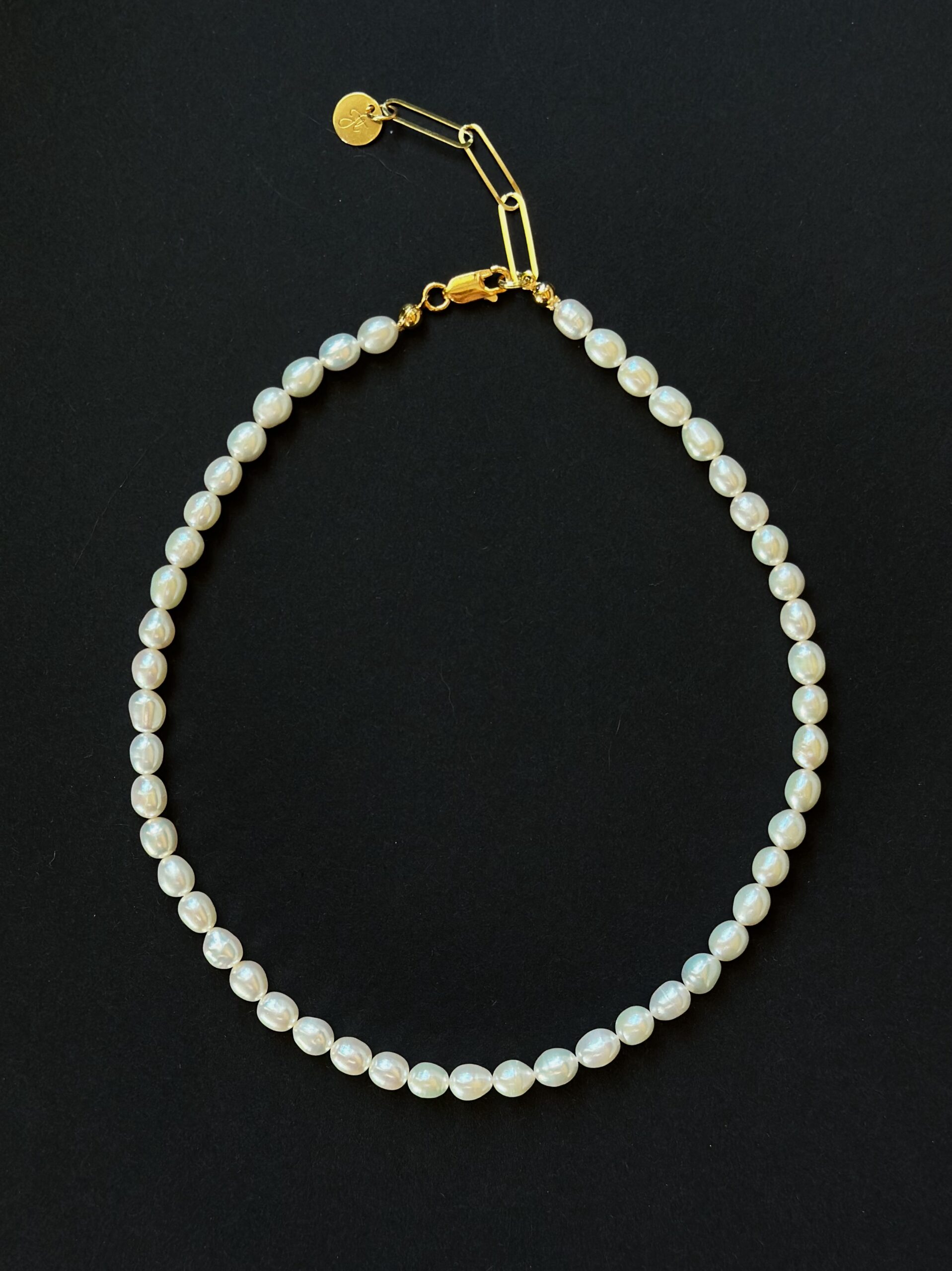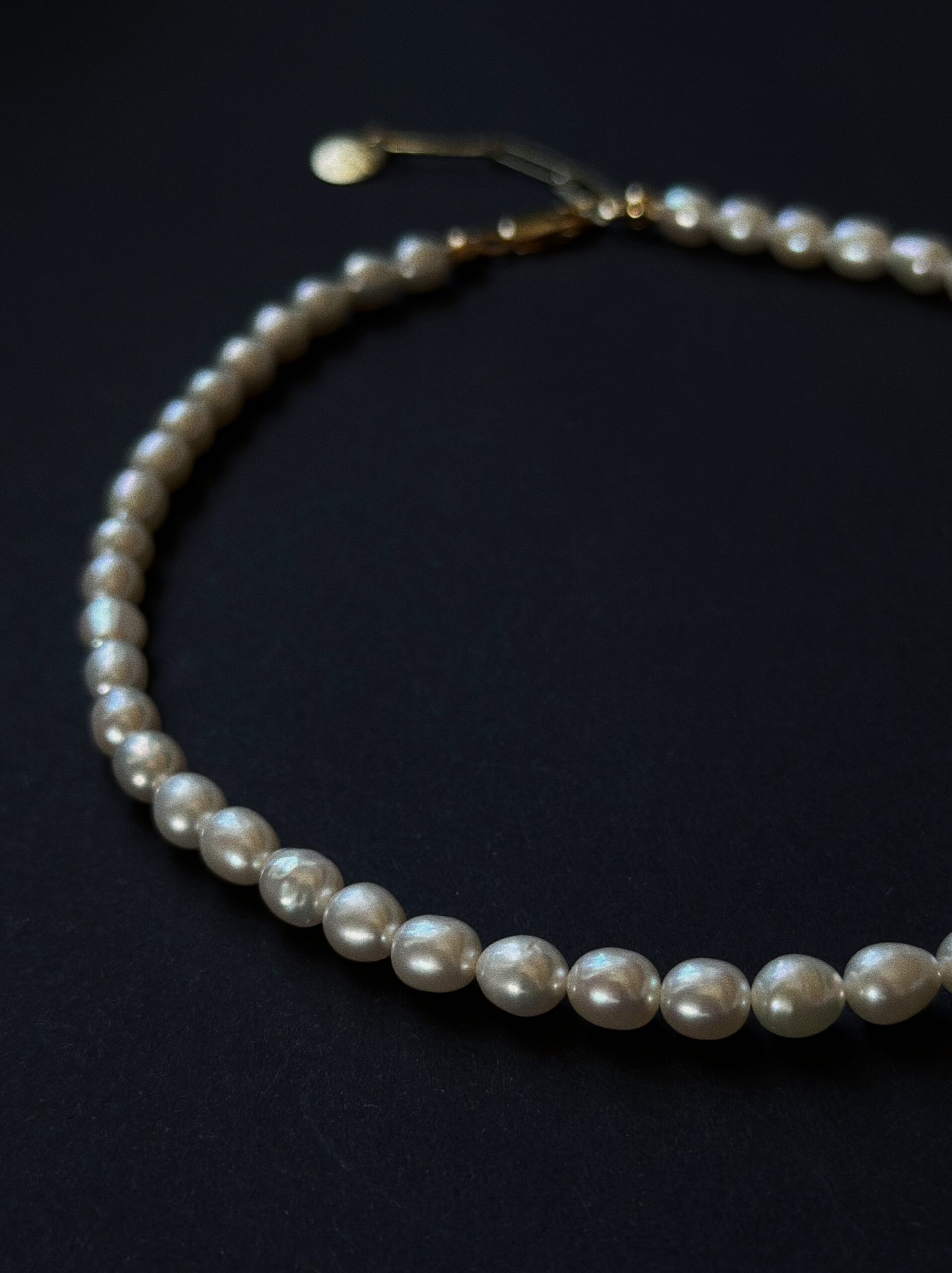 Choker Classy to bardzo klasyczny krótki choker z pereł naturalnych w kształcie oliwek. Wykończony złoconym srebrem posiada przedłużkę z łańcuszka o dużych ogniwach.