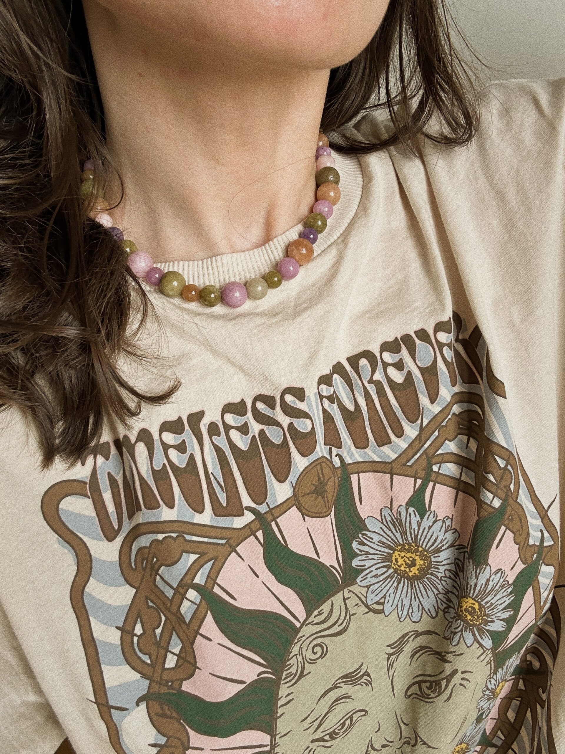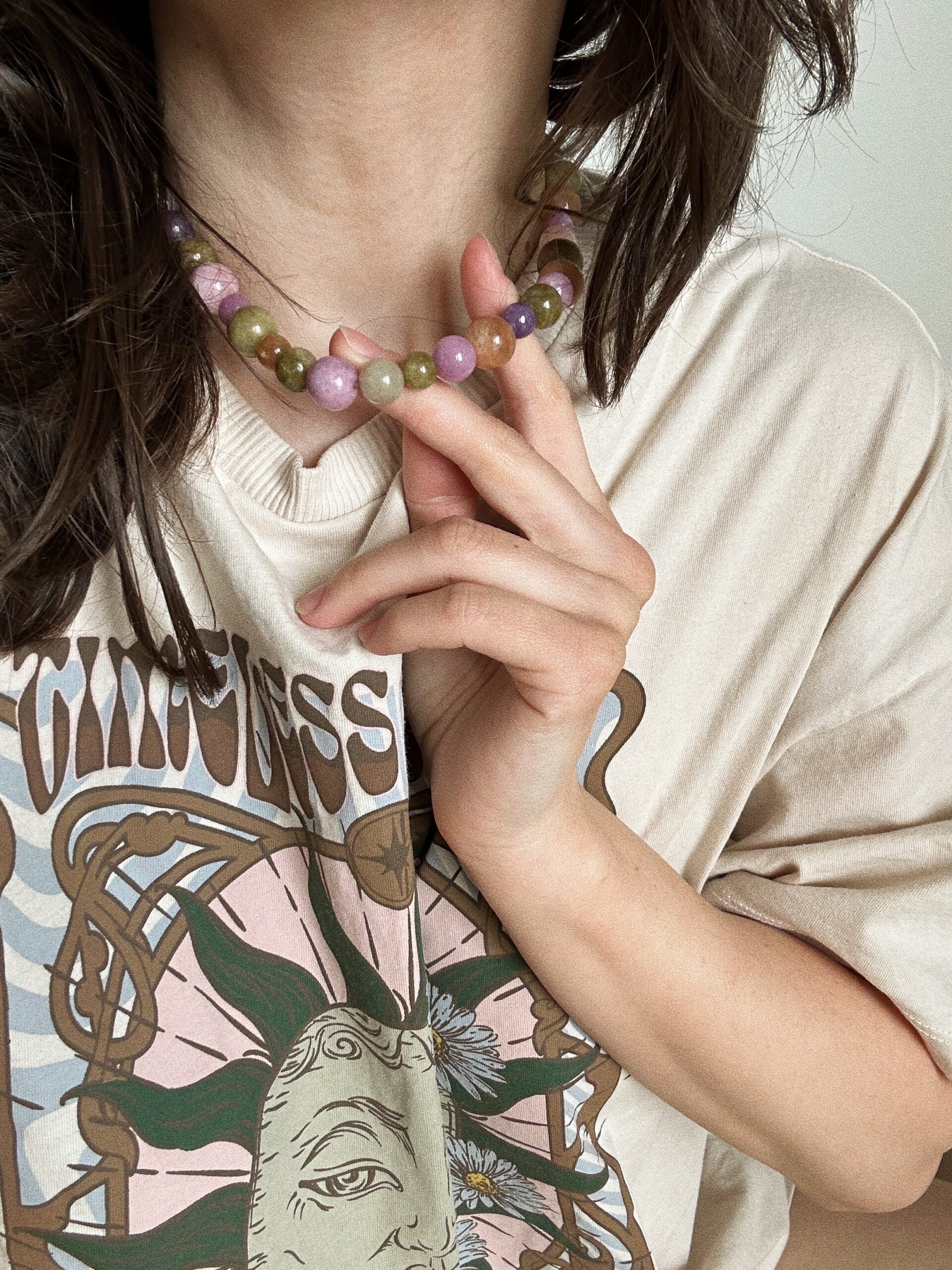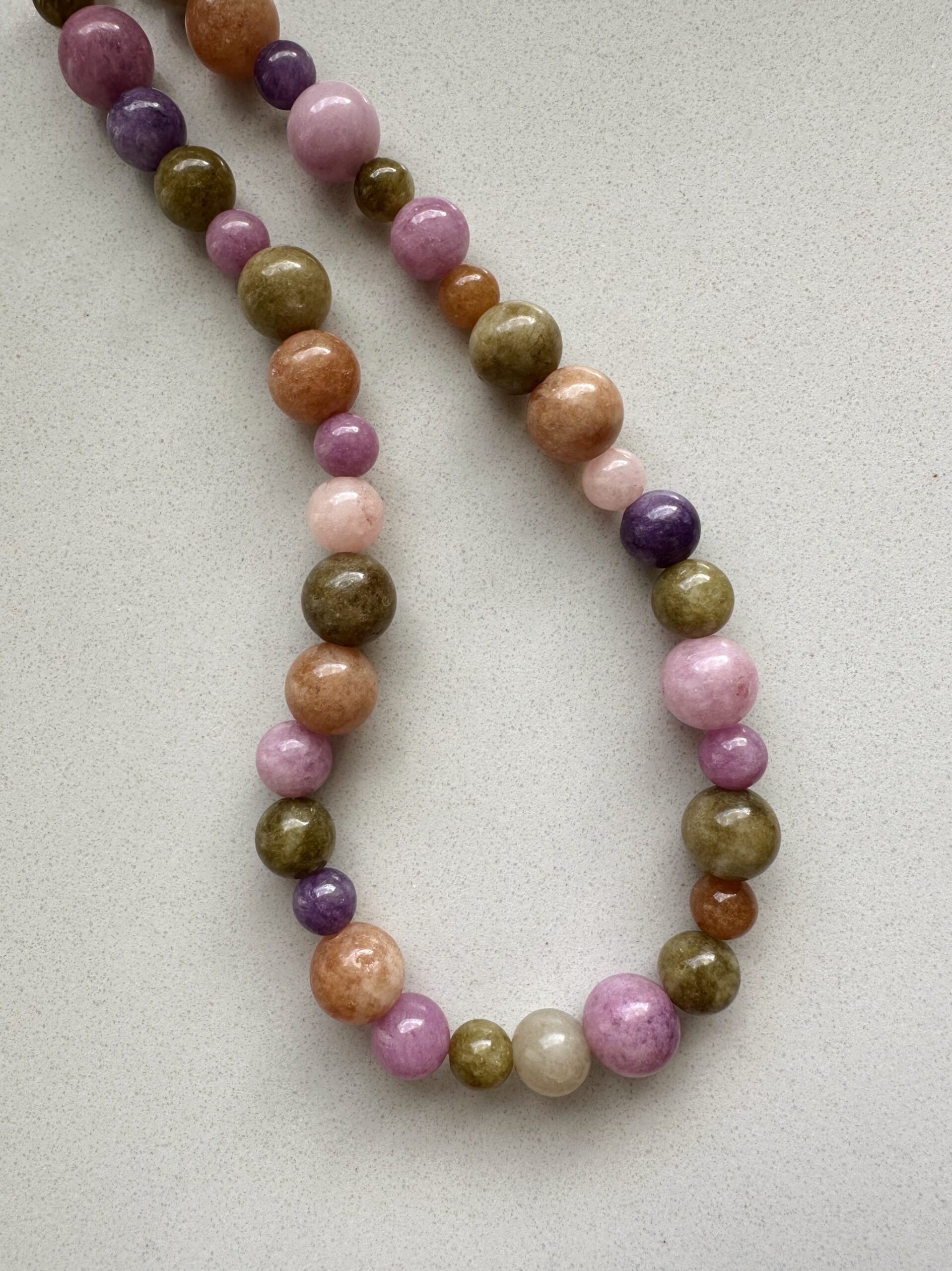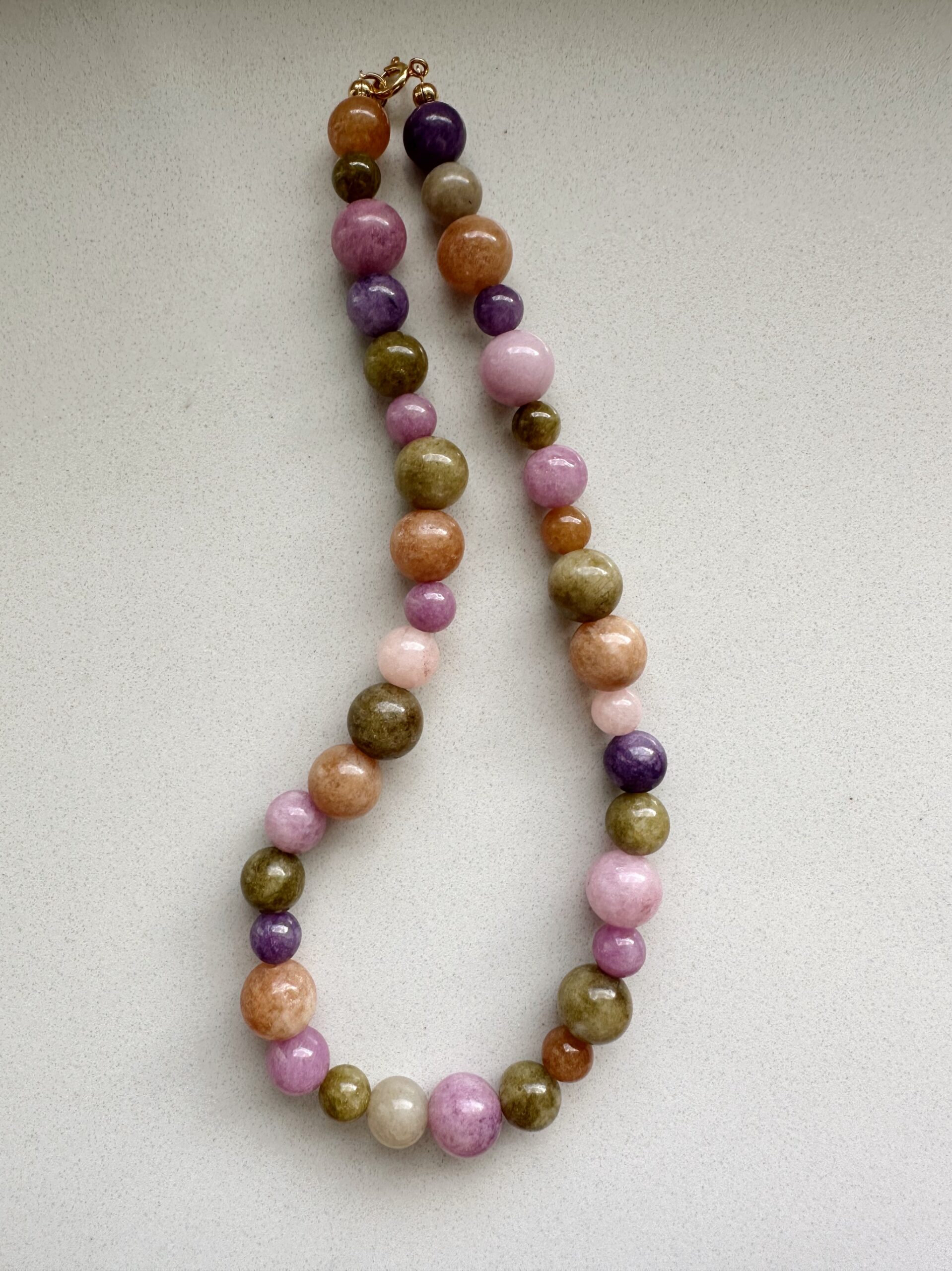 Naszyjnik Tea Time to jadeit w trzech różnych rozmiarach i kilku kolorach. Gładkie kulki idealnie ze sobą współgrają kolorystycznie i będą pasowały do wielu stylizacji w chłodnej tonacji. Naszyjnik nawinięty jest na wysokiej jakości nić.