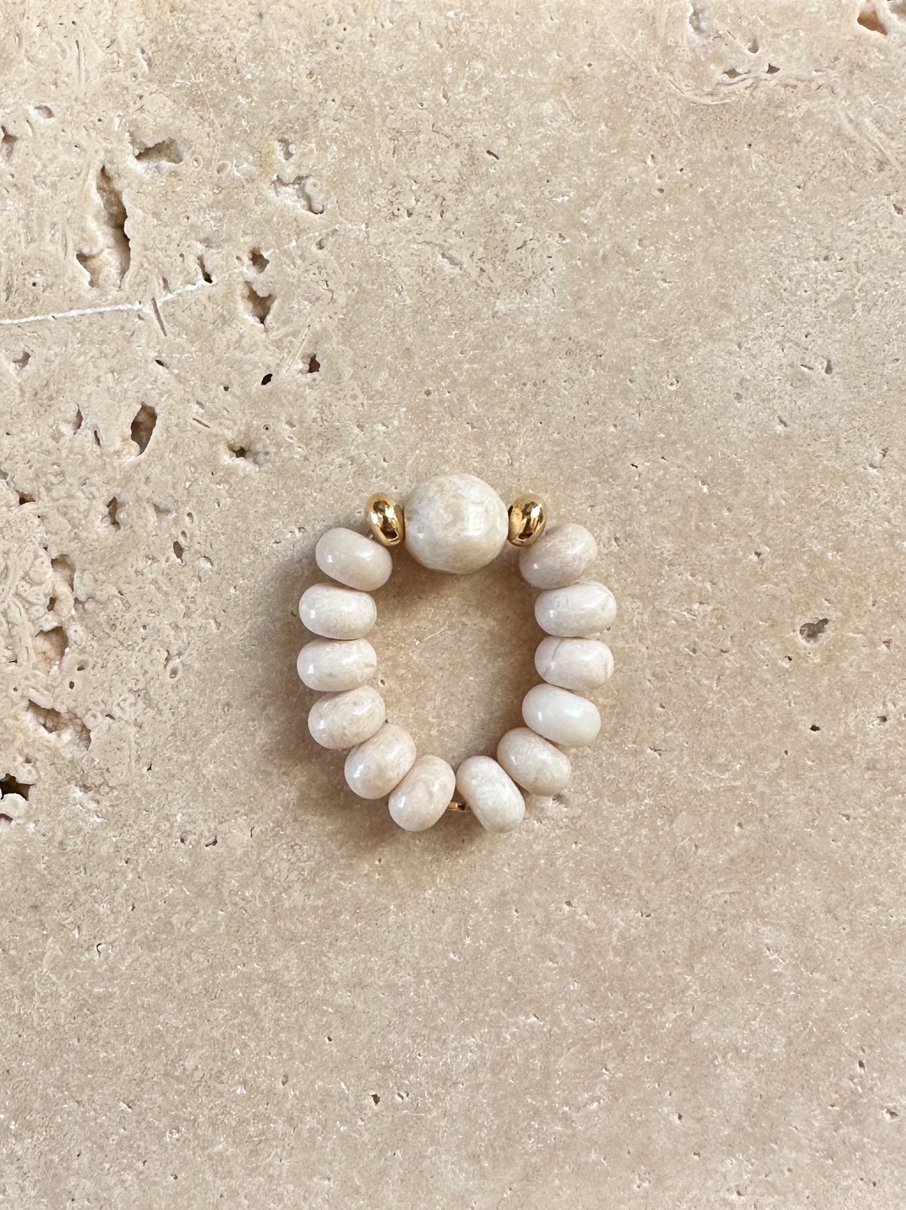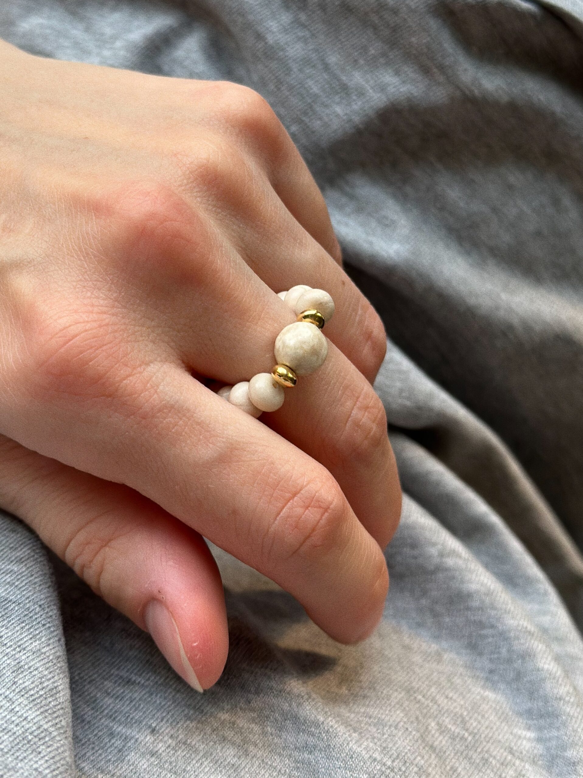 Pierścionek Beige to przepiękny kamień rzeczny w kształcie oponek i kuli w centralnym punkcie. Kamienie są w większym rozmiarze, by było je widać w jesiennych i zimowych stylizacjach. Pierścionek nawinięty jest na elastyczną linkę jubilerską.