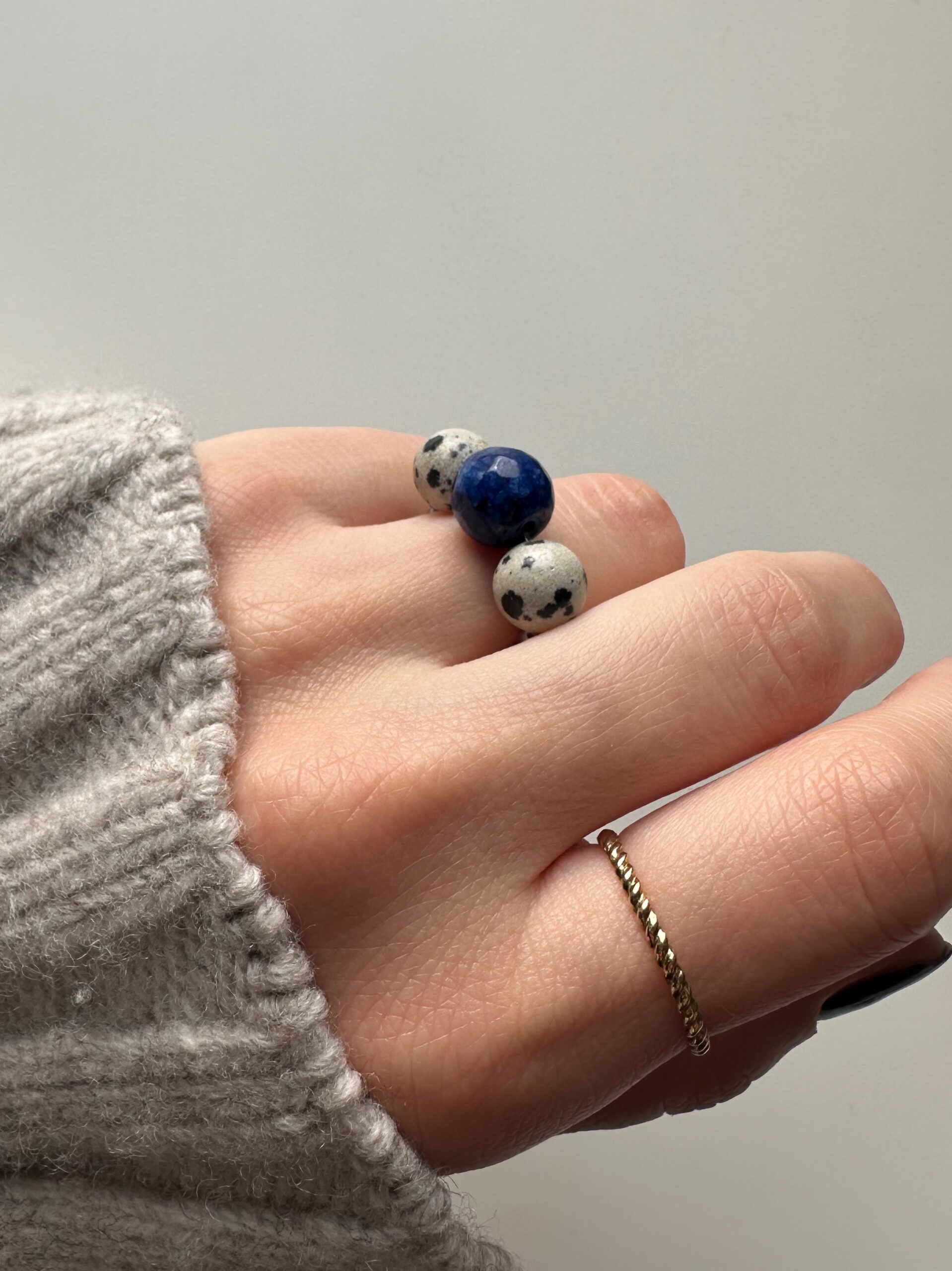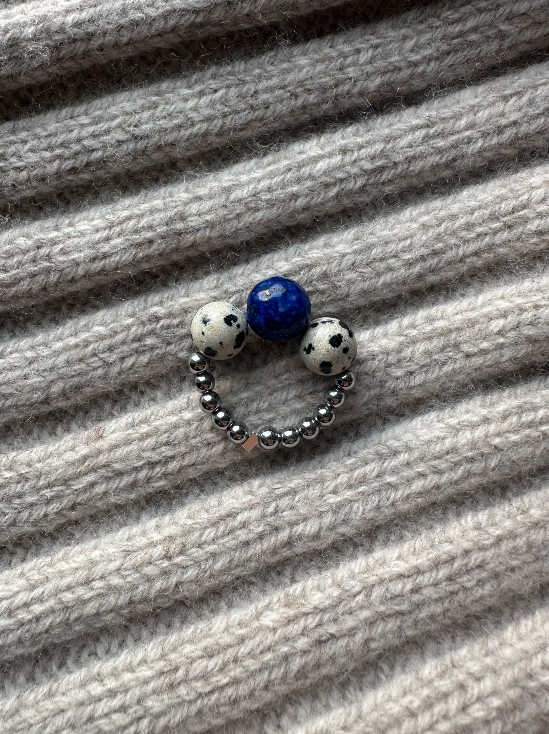 Pierścionek Daphne to hematyt, jaspis dalmatyński i granatowy jadeit. Całość nawinięta na elastyczną jubilerską żyłkę.