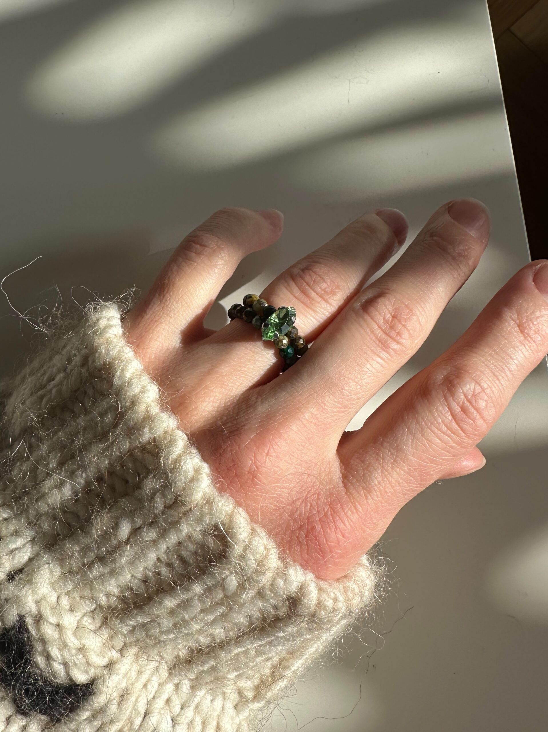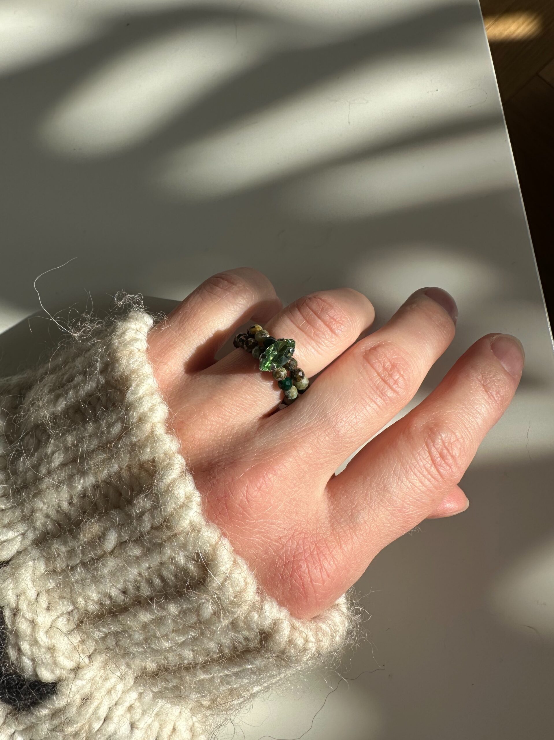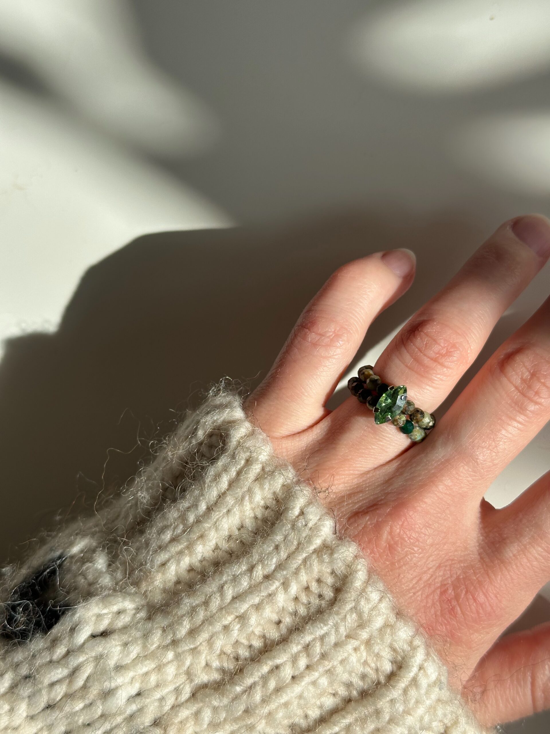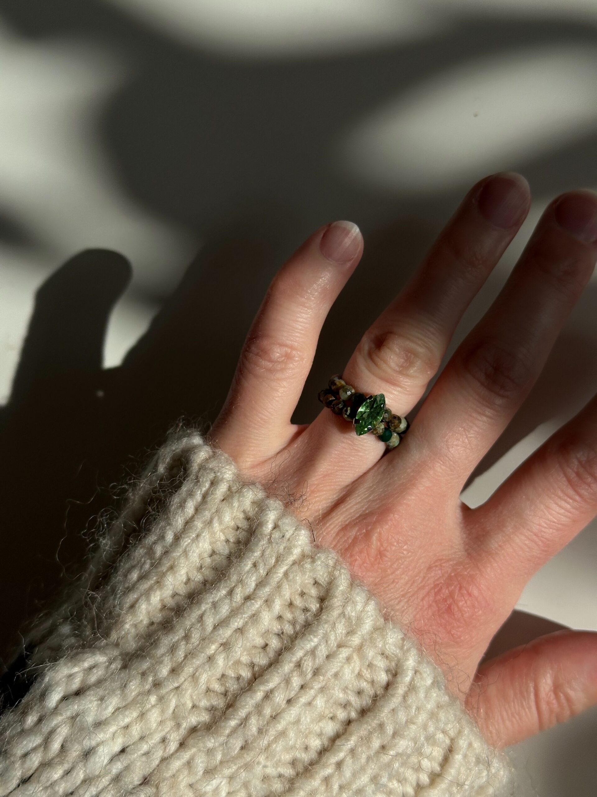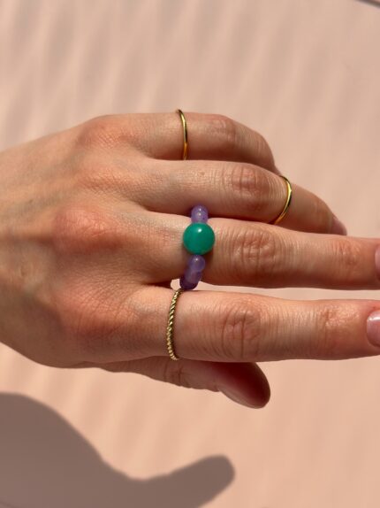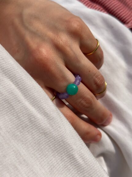 Pierścionek Forest Moss to cisany turkus w odcieniach zieleni, brązu i lasu. Dodatkowo w pierścionku lśni kamyk przypominający cyrkonię. Pierścionek jest na gumce, zatem idealnie dopasowuje się do palca.