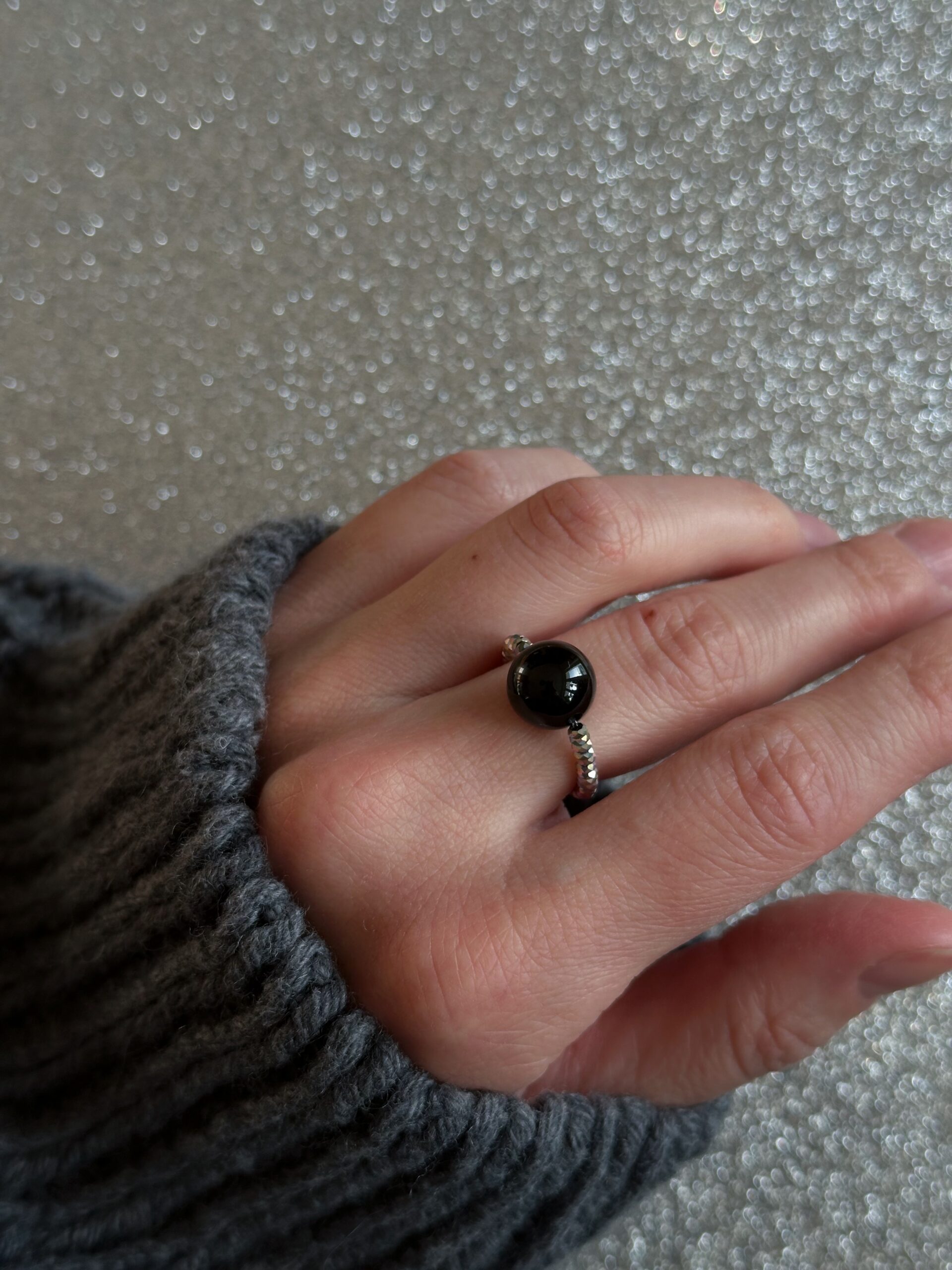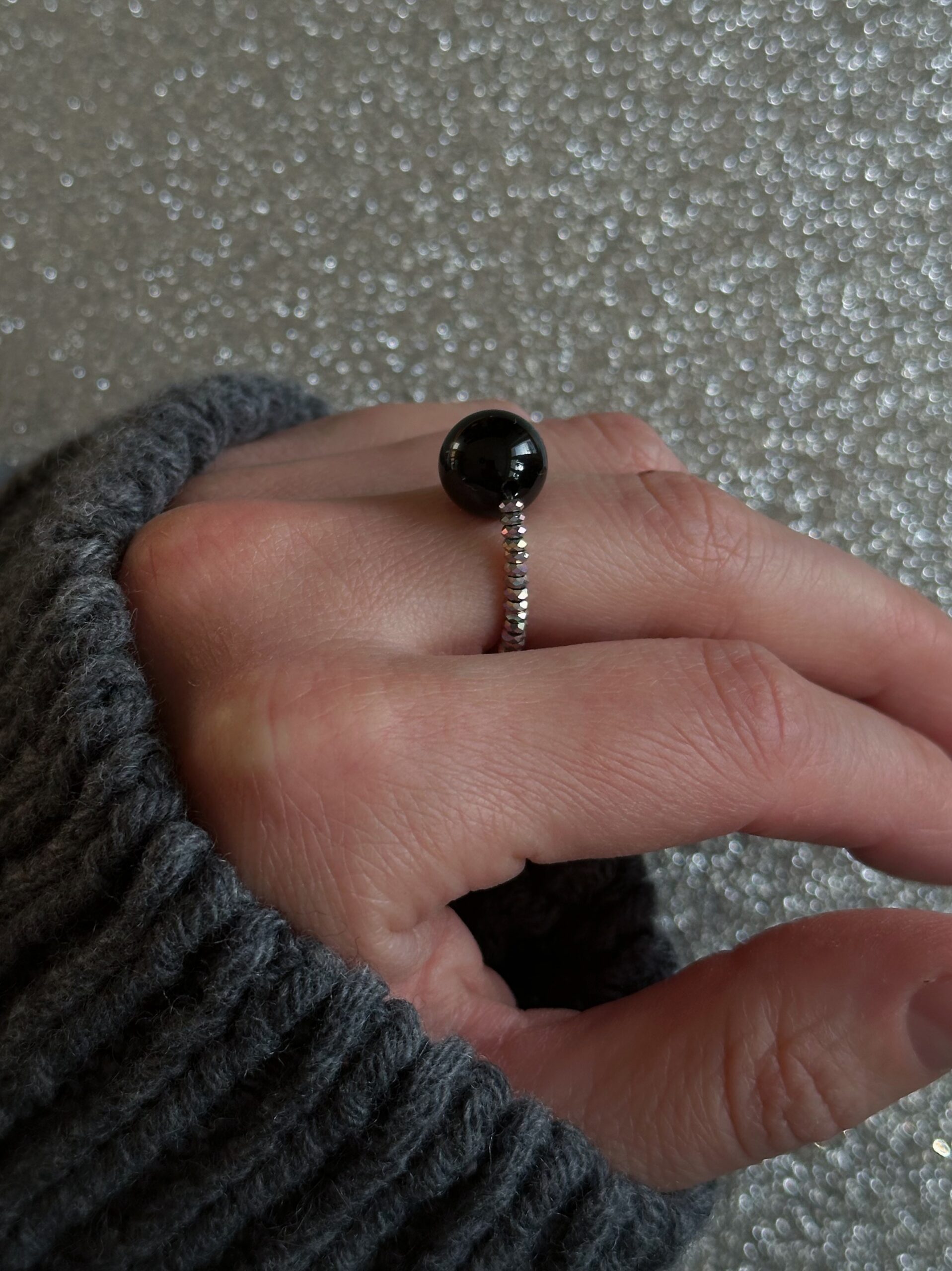 Pierścionek Onyx Holo to pierścionek z hematytu galwanizowanego na kolor srebrny z efektem holograficznym. Na środku znajduje się duży kamień onyksu.