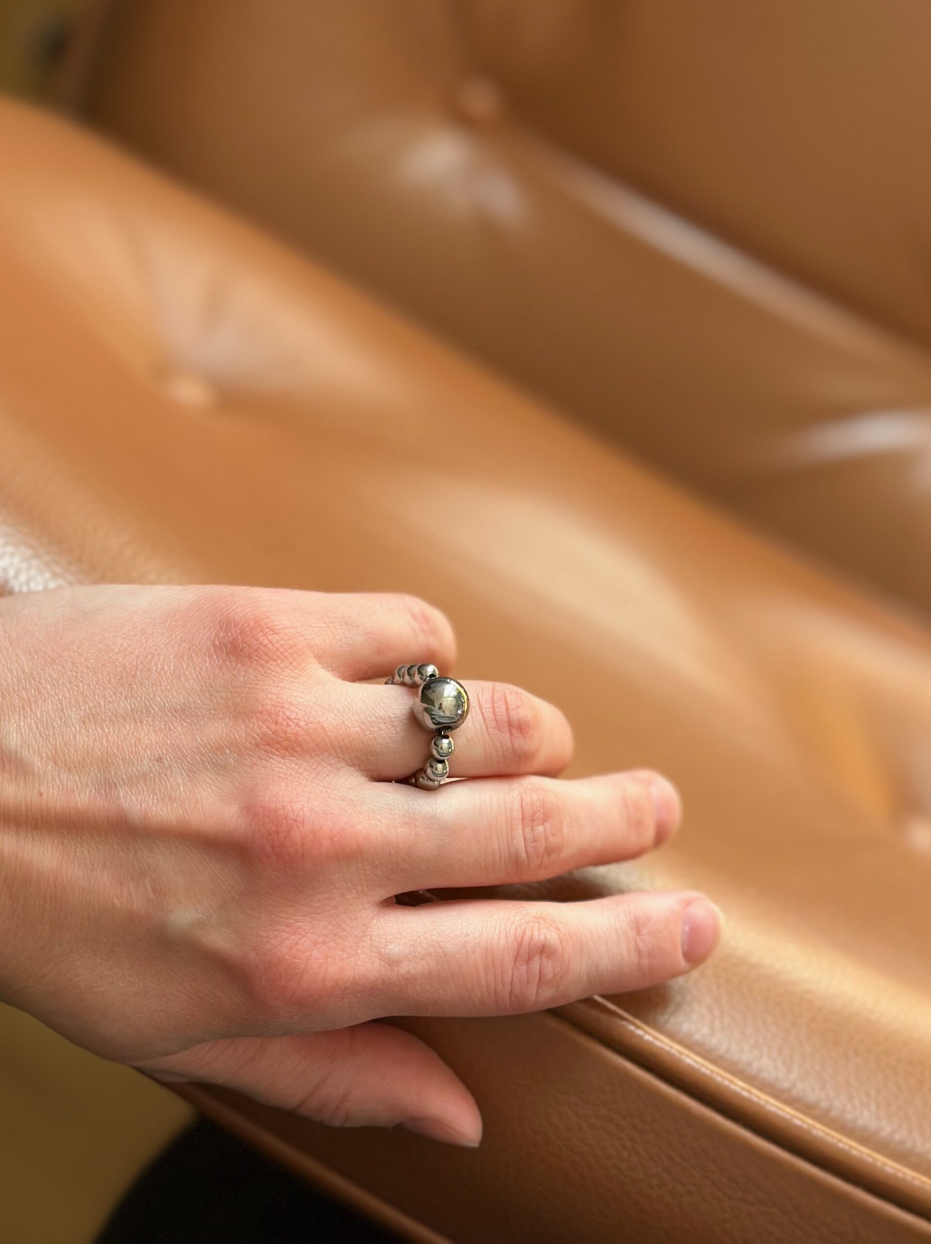 Pierścionek Silver to srebrny hematyt w dwóch rozmiarach. Pierścionek nawinięty jest na elastyczną żyłkę jubilerską.